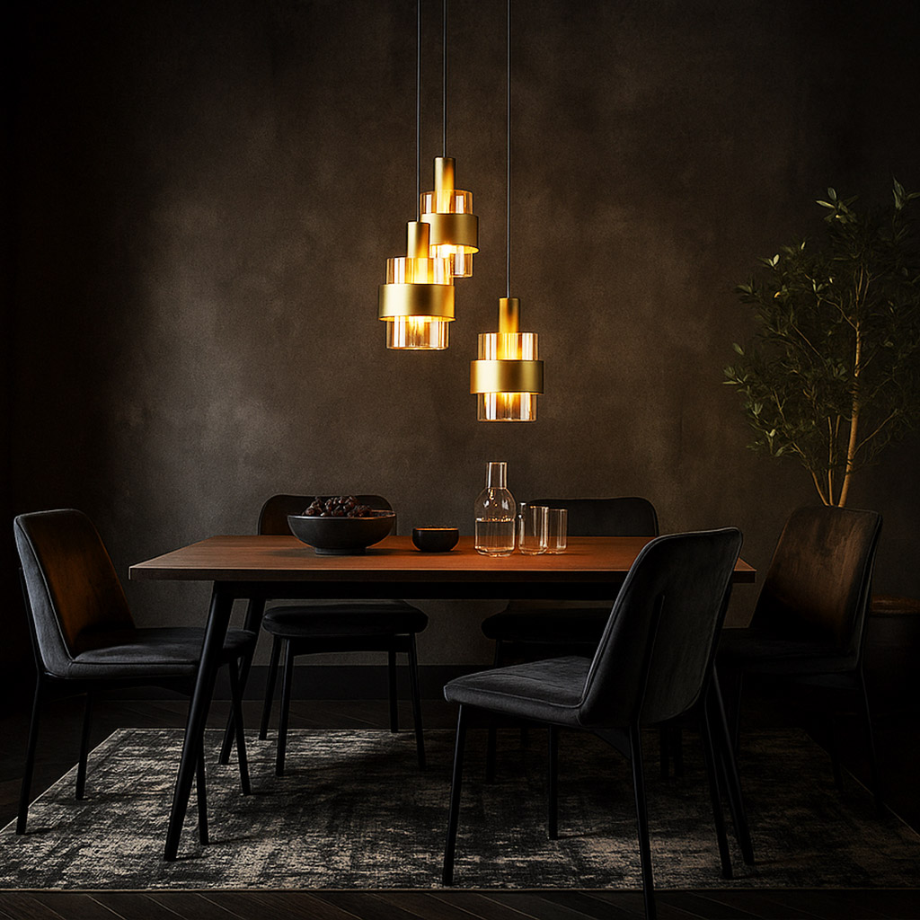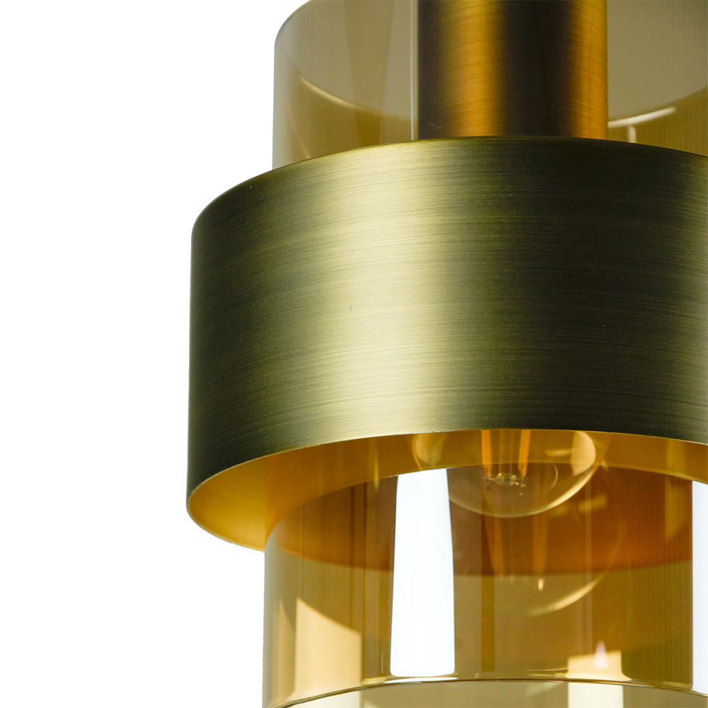 Voeg een vleugje luxe en elegantie toe aan je interieur met deze stijlvolle 3-lichts hanglamp. De lamp combineert een moderne vormgeving met warme materialen: het bronskleurige armatuur en de amberkleurige glazen kappen zorgen voor een sfeervol lichtbeeld en een chique uitstraling. Perfect boven een eettafel, woonkamer of in de slaapkamer! Deze hanglamp bestaat uit drie identieke pendels aan een strakke, zwarte plafondbevestiging. Elke pendel heeft een cilindervormige glazen kap in een warme amber kleur waar een bronze kap omheen hangt, die samen een gelaagd en warm lichteffect creëren. De hoogwaardige afwerking en het gebruik van duurzame materialen maken deze lamp niet alleen een lust voor het oog, maar ook een waardevolle toevoeging aan elk interieur.