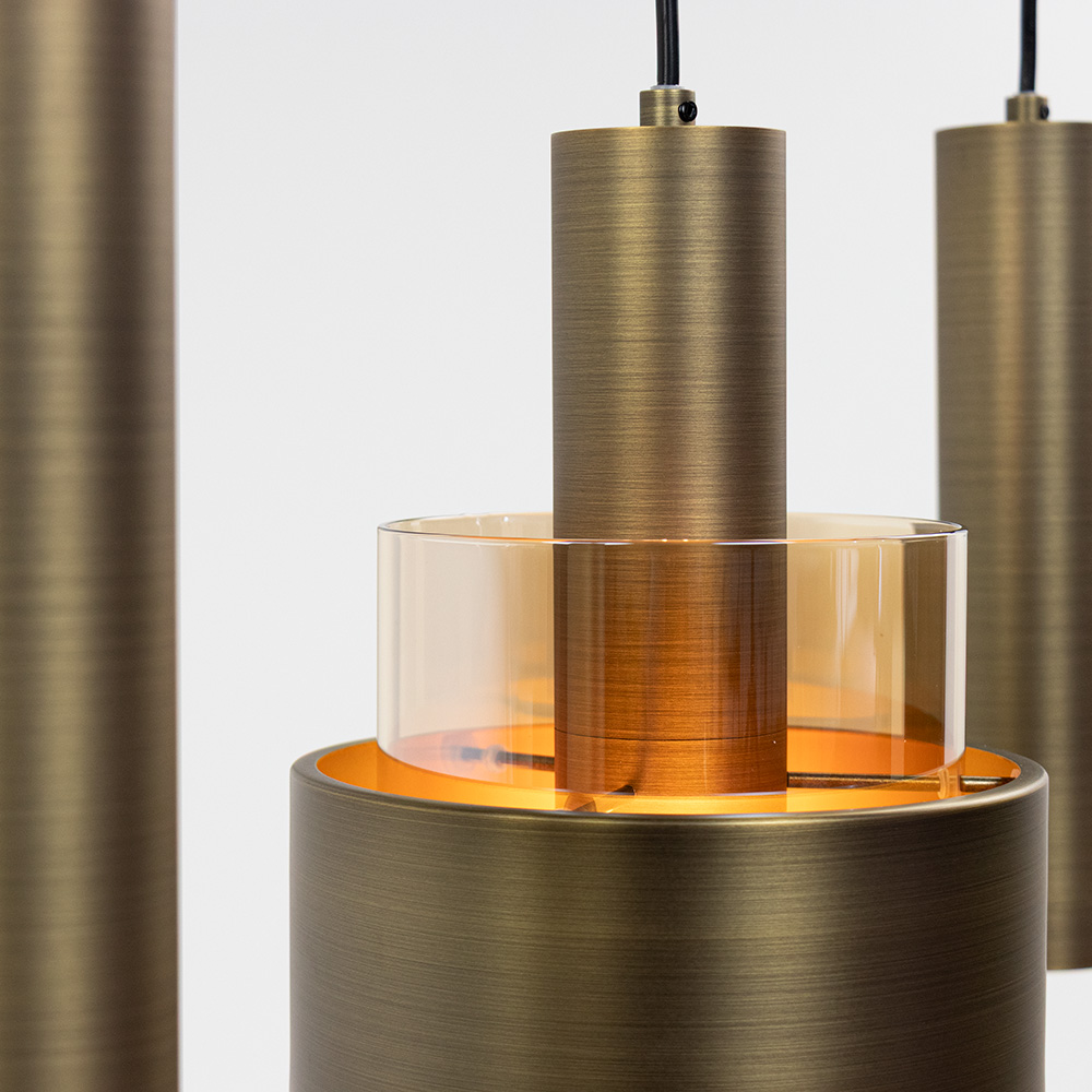 Voeg een vleugje luxe en elegantie toe aan je interieur met deze stijlvolle 5-lichts hanglamp. De lamp combineert een moderne vormgeving met warme materialen: het bronskleurige armatuur en de amberkleurige glazen kappen zorgen voor een sfeervol lichtbeeld en een chique uitstraling. Perfect boven een eettafel of kookeiland! Deze hanglamp bestaat uit 5 pendels aan een strakke, zwarte plafondbalk. 3 pendels hebben een cilindervormige glazen kap in een warme amber kleur waar een bronze kap omheen hangt. Samen met de 2 bons kleurige cilinder pijpjes creëren zij een gelaagd en warm lichteffect. De hoogwaardige afwerking en het gebruik van duurzame materialen maken deze lamp niet alleen een lust voor het oog, maar ook een waardevolle toevoeging aan elk interieur.