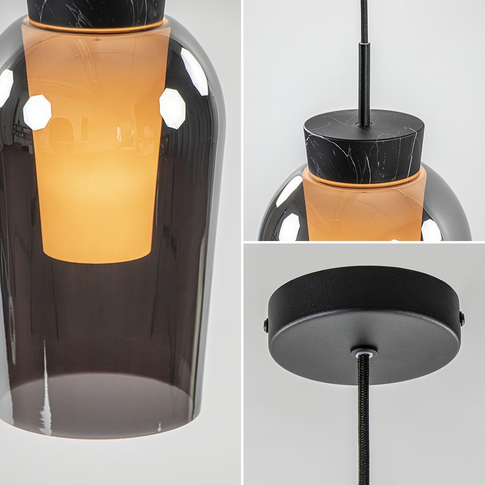 Een moderne hanglamp met een luxe uitstraling. Deze hanglamp heeft een smoke glas. Het smoke glas heeft een wit binnen glas wat de hanglamp een mooi effect geeft als de verlichting aan staat. De combinatie tussen het smoke glas en het witte binnen glas geeft de hanglamp een sierlijke uitstraling. De fitting van de hanglamp zwart marmer effect. De hanglamp is gemakkelijk in hoogte te verstellen. Leuk voor in een hal, als extra lichtpunt in de woonkamer of voor boven het nachtkastje.
