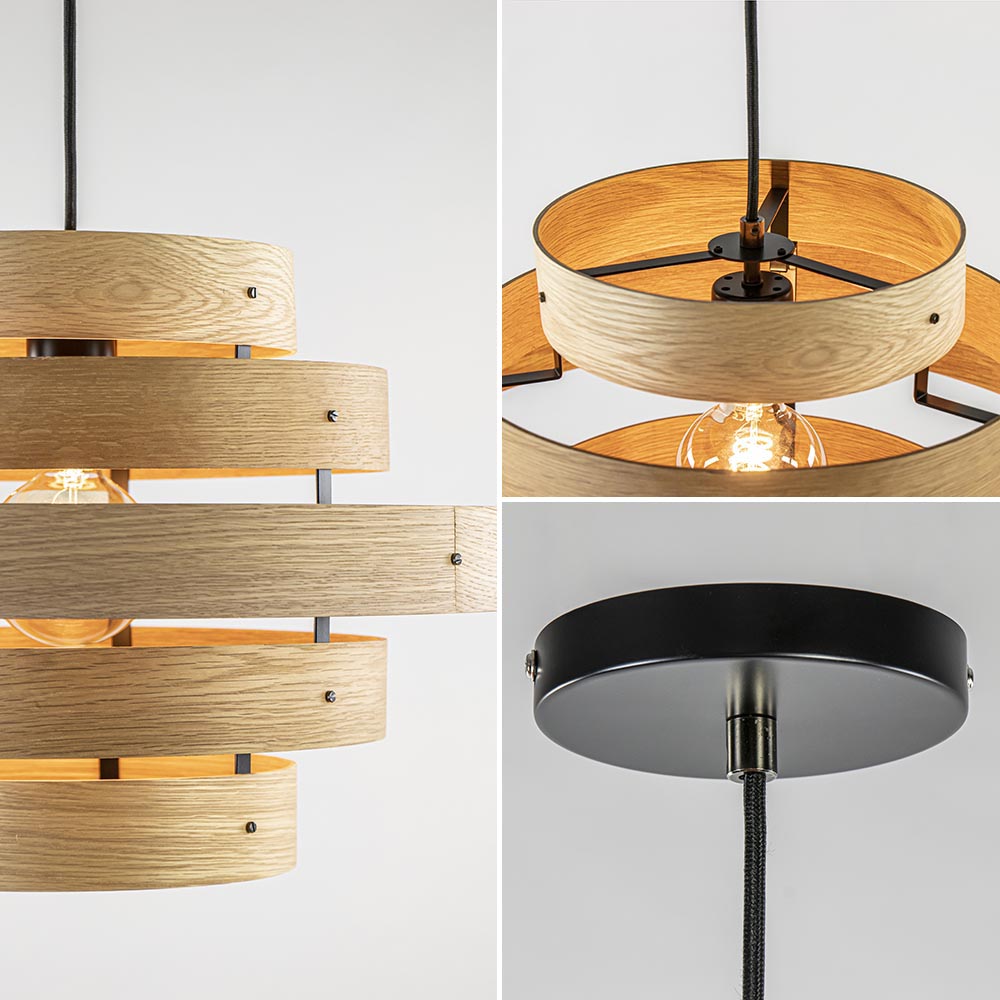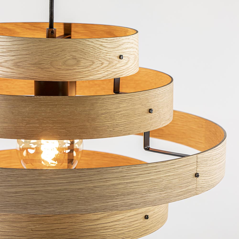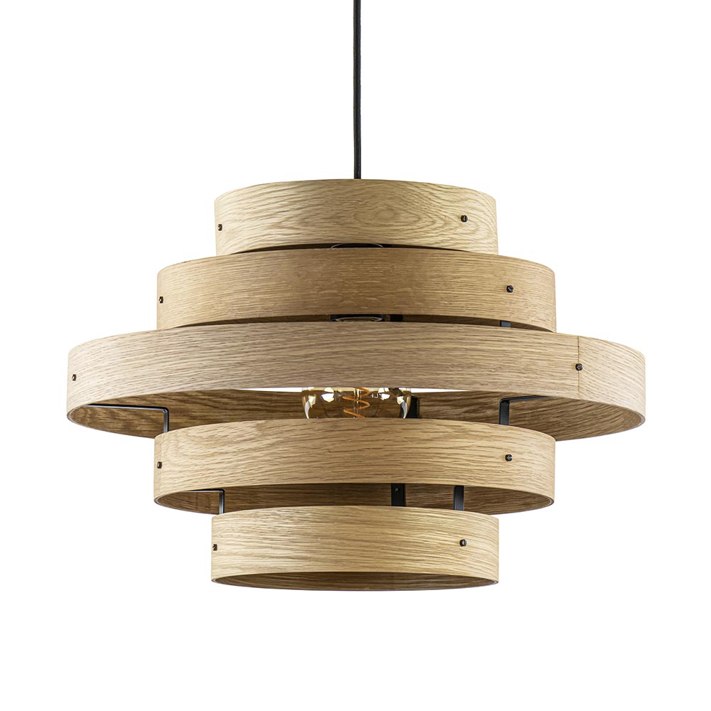 Deze fraaie hanglamp bestaat uit cirkelvormige eiken houten latten. De houten ringen hangen trapsgewijs aan een zwart snoer. De hanglamp heeft een mooie natuurlijke uitstraling. Het snoer van de hanglamp is gemakkelijk in hoogte te verstellen. Hiermee maakt u de lamp passend naar wens. De hanglamp wordt zonder lichtbron geleverd.
