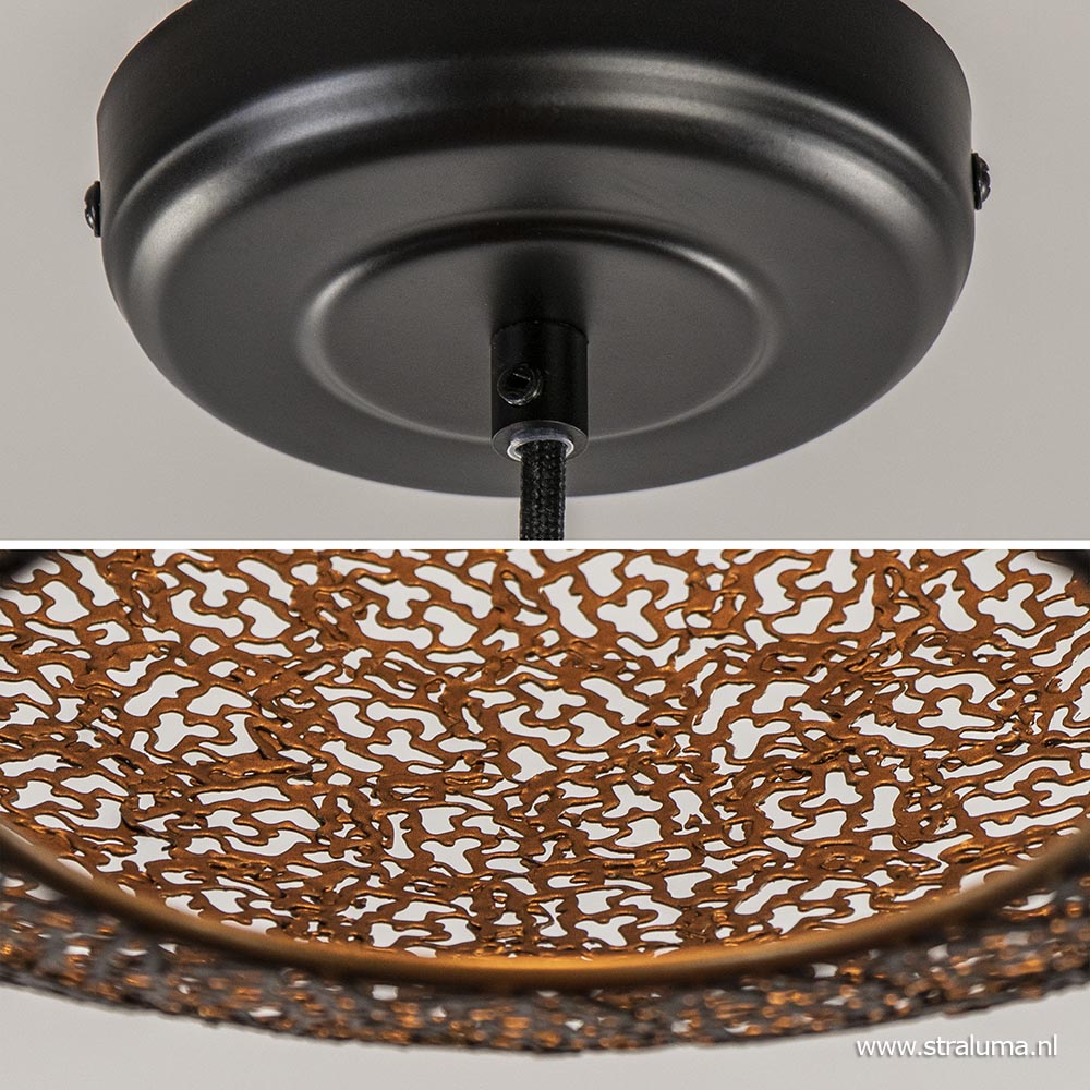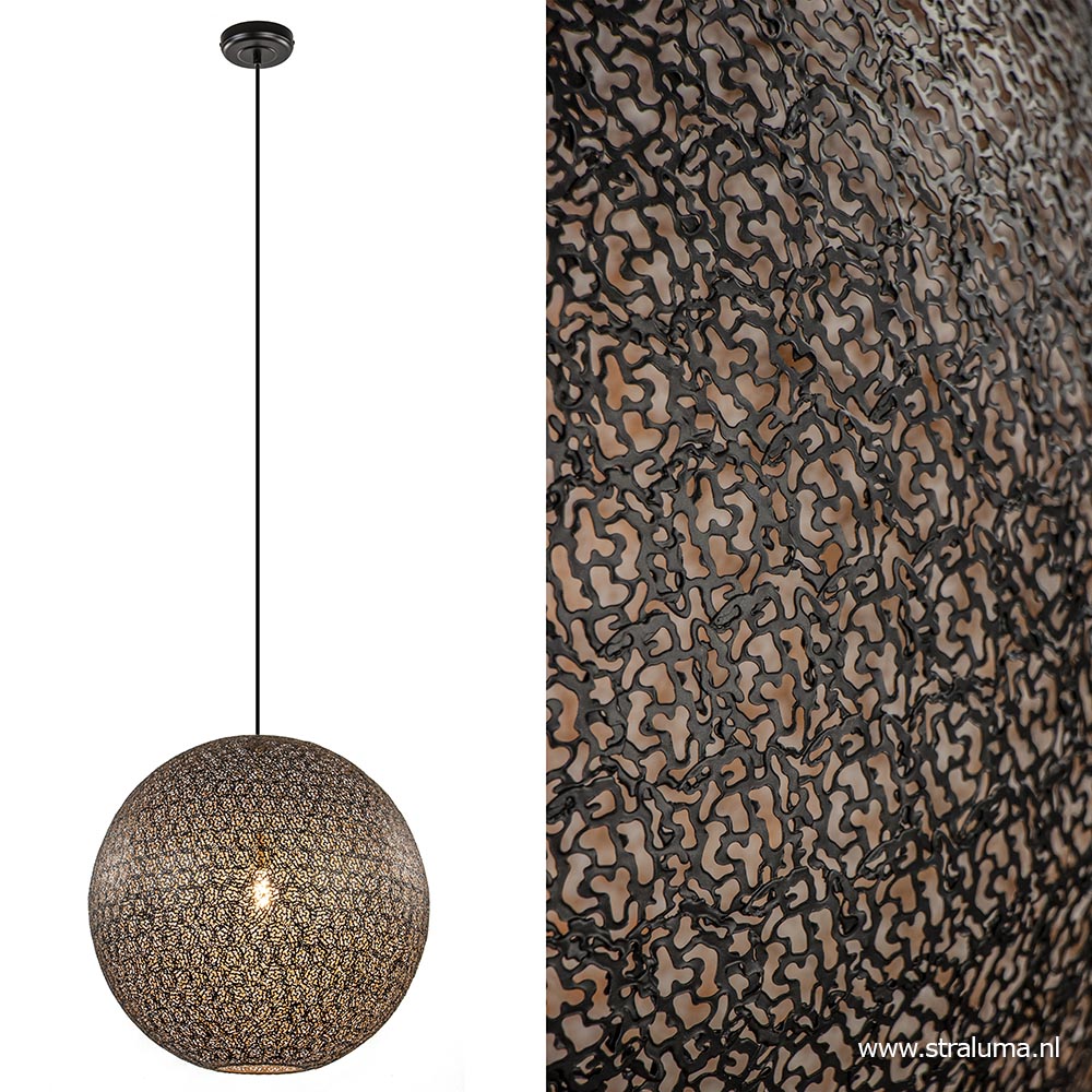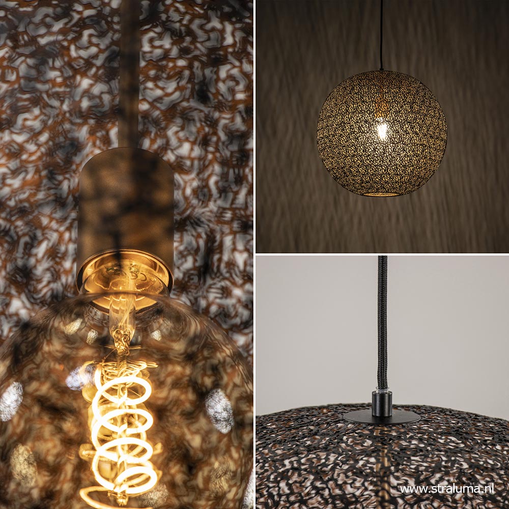 Modern met een chique uitstraling. Deze grote hanglamp is gemaakt uit kleine metalen deeltjes die samen de ronde kap vormen. De deeltjes zijn mat zwart aan de buitenzijde en goud aan de binnenzijde. Hierdoor krijgt de grote bol een luxe uitstraling en tevens zorgt het goud voor een warme sfeervolle verlichting. Het goud is doorgetrokken in de fitting binnenin de kap om het geheel af te maken. De metalen bol van maar liefst 60 cm hangt aan een zwart stof omwonden snoer en wordt met een metalen bevestiging aan het plafond opgehangen. Het snoer is naar wens in te korten zodat u de lamp overal kunt ophangen. Door z’n grootte past de lamp mooi boven een grote ronde tafel of maak een statement met twee naast elkaar boven een langwerpige tafel.