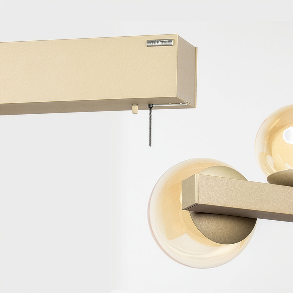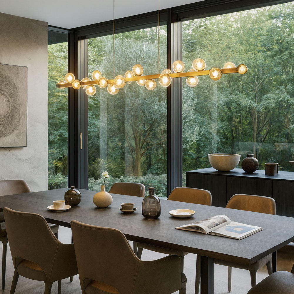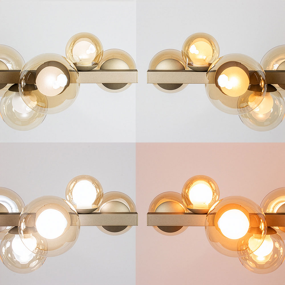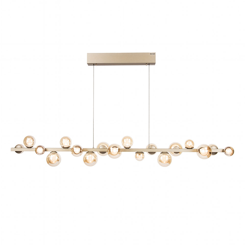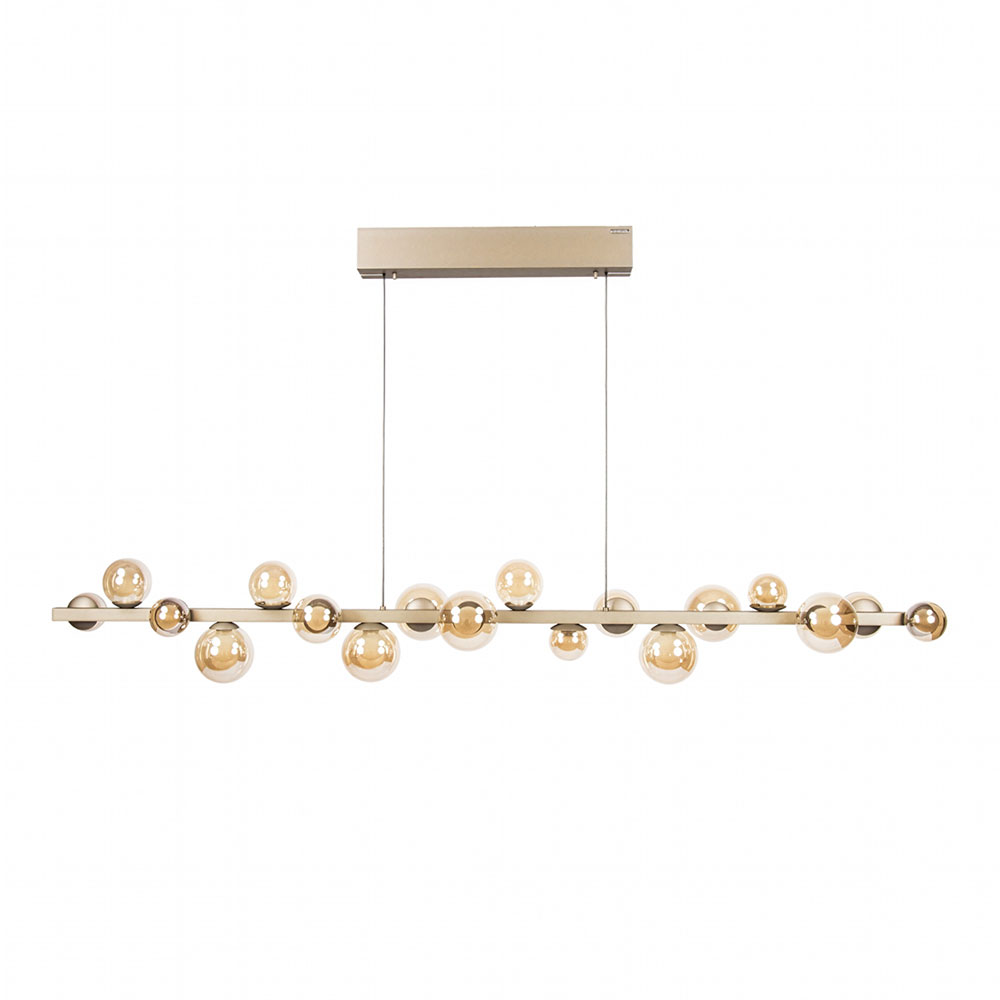 Specificaties: • Merk: PURE • Serie: E-Popup • Kleur: Brons • Afmetingen lamp: H 45–240 × L 180 × B 29,5 cm • Afmetingen plafondbevestiging: H 8,5 × L 55 × B 8,5 cm • Aantal lichtpunten: 18 • Glazen bollen: 7 × Ø 12 cm, 6 × Ø 10 cm, 5 × Ø 8 cm • Materiaal: Metaal & glas • Lichtbron: Geïntegreerde LED (niet vervangbaar) • Lichtkleur: 2700K–5000K (CCT instelbaar) • Dimbaar: Ja, traploos via afstandsbediening • Hoogte verstelbaar: via e-LIFT® systeem