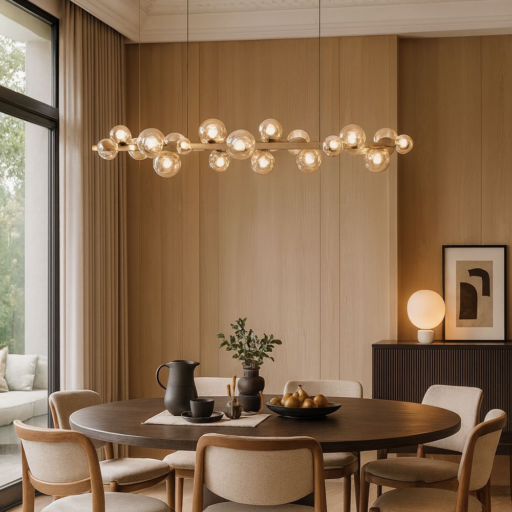 De lamp is voorzien van maar liefst 18 glazen bollen in drie verschillende formaten: 7 × Ø 12 cm, 6 × Ø 10 cm en 5 × Ø 8 cm. Deze verdeling zorgt voor een speels en dynamisch lijnenspel dat de ruimte een moderne en elegante sfeer geeft.