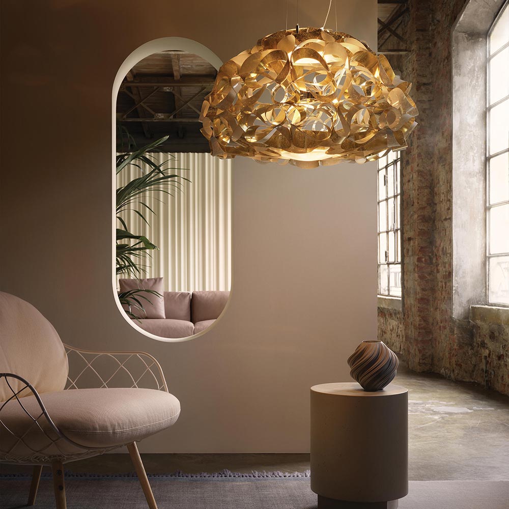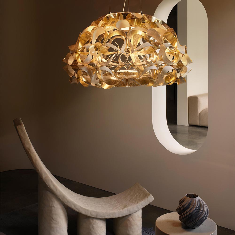 Dit prachtige design is een ware eyecatcher in uw woning. Gemaakt van de meest ingenieuze materialen wat de prachtige vorm van de lamp mogelijk maakt. De Quantica van het Italiaanse merk Slamp heeft een kap met een doorsnede van 74 cm. Prachtig voor boven een grote eettafel, in de hal of in de slaapkamer. Met zijn elegante design steelt deze lamp de show. De kap is aan de boven en onderzijde voorzien van lichtpunten met een diffuser zodat er sfeervol licht kan worden verspreid. Dit wordt ook in de lamp verspreid waardoor de gouden kap een waar spektakel wordt om te zien. De grote hanglamp hangt aan 3 smalle draden en een snoer en wordt met een ronde witte bevestiging aan het plafond opgehangen. De Italiaanse design hanglamp wordt geleverd zonder lichtbronnen.