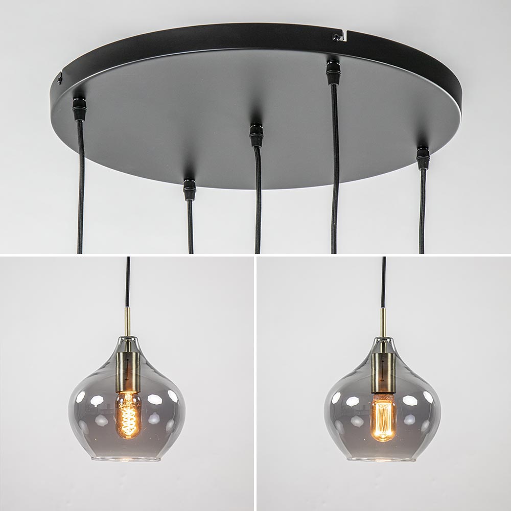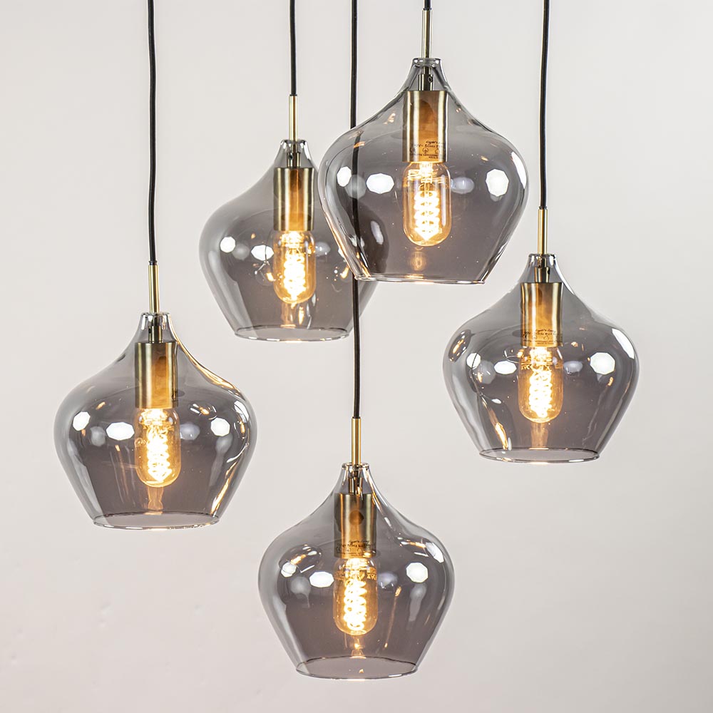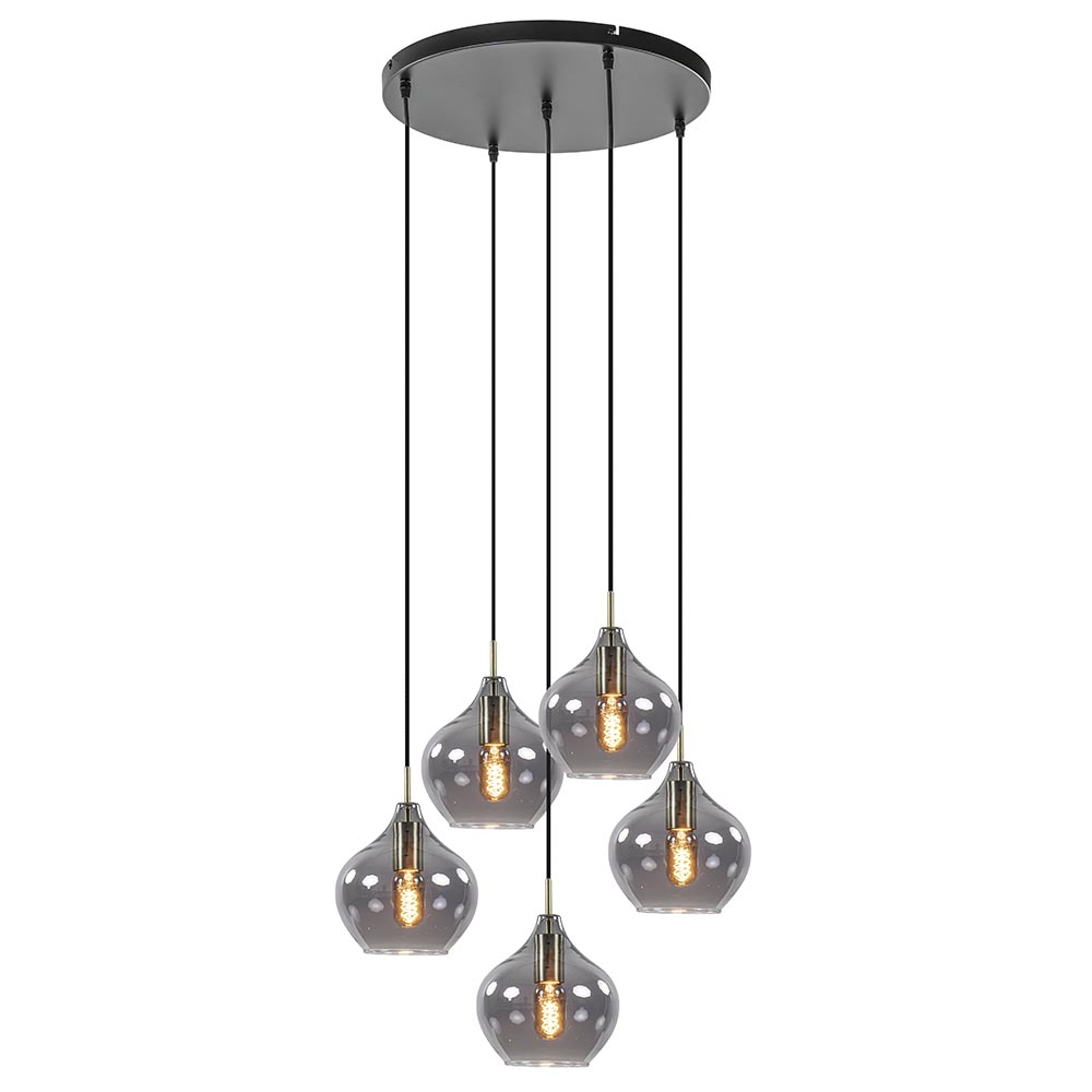 Homepagina / Lampen / Eettafellampen / Hanglamp Rakel 5L rond antiek brass + smoke glas