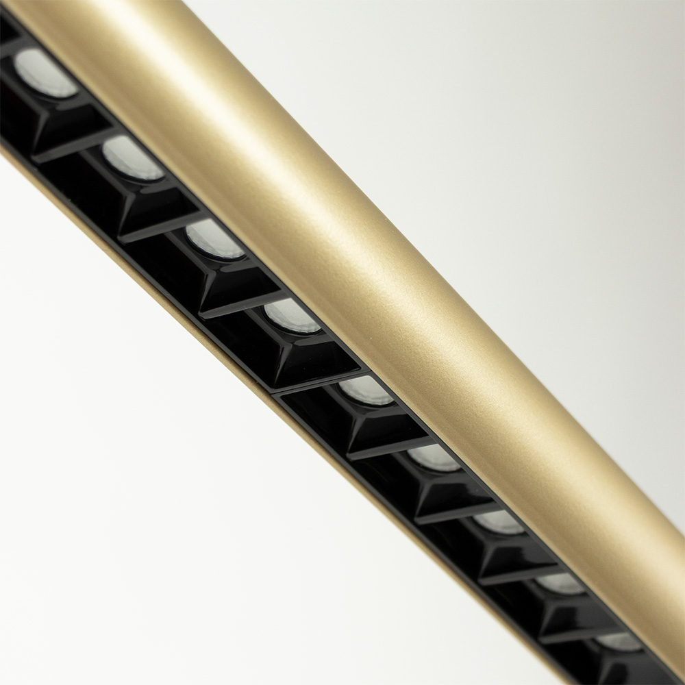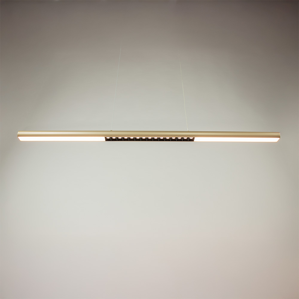 De Rider hanglamp staat voor moderne eenvoud met een functionele twist. Het dunne, langwerpige ontwerp in een goude kleur met subtiele lichtopeningen biedt een verfijnde oplossing voor wie houdt van strak design zonder in te leveren op lichtkwaliteit. Dankzij de slanke vorm past deze lamp perfect boven een eettafel, kookeiland of werkplek. De geïntegreerde LED-verlichting is verdeeld over het volledige armatuur en voorzien van een centrale lichtfocus met raster, waardoor het licht doelgericht naar beneden straalt zonder hinderlijke verblinding. Zo ontstaat een prettige mix van sfeervol en gericht licht. De Rider is bovendien in drie standen dimbaar via een standaard wandschakelaar en in hoogte verstelbaaar. Ideaal voor elk moment van de dag.