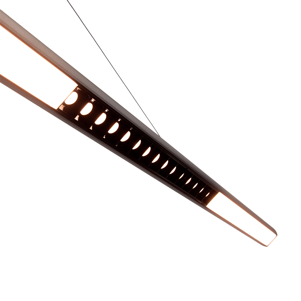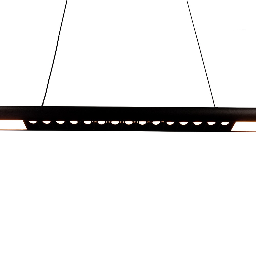 De Rider hanglamp staat voor moderne eenvoud met een functionele twist. Het dunne, langwerpige ontwerp in mat zwart met subtiele lichtopeningen biedt een verfijnde oplossing voor wie houdt van strak design zonder in te leveren op lichtkwaliteit. Dankzij de slanke vorm past deze lamp perfect boven een eettafel, kookeiland of werkplek. De geïntegreerde LED-verlichting is verdeeld over het volledige armatuur en voorzien van een centrale lichtfocus met raster, waardoor het licht doelgericht naar beneden straalt zonder hinderlijke verblinding. Zo ontstaat een prettige mix van sfeervol en gericht licht. De Rider is bovendien in drie standen dimbaar via een standaard wandschakelaar en in hoogte verstelbaaar. Ideaal voor elk moment van de dag.