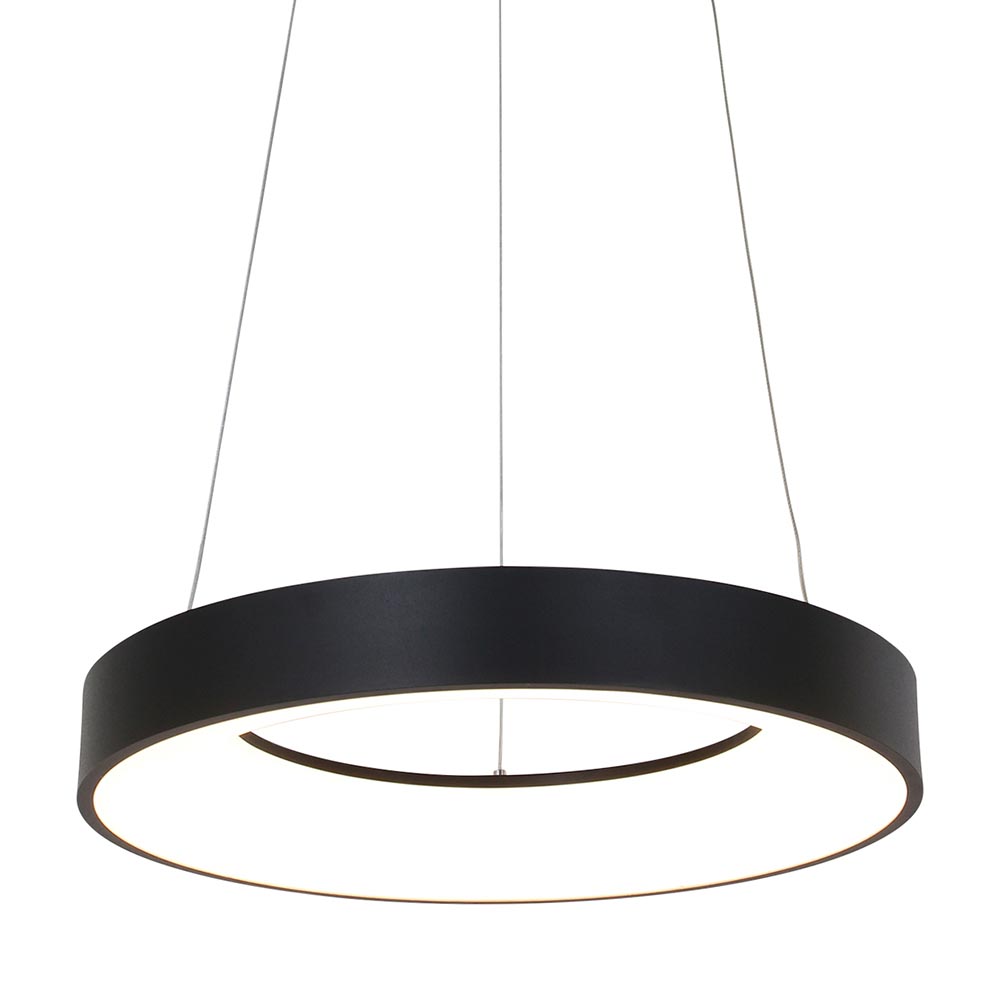 Deze moderne hanglamp is een ideale toevoeging aan het interieur. De zwarte hanglamp is prima geschikt voor een eetkamer, slaapkamer of kantoor. De ronde hanglamp bestaat uit een metalen ring die is voorzien van een LED strip aan de binnenzijde van de kap. Het LED geeft met 2700 Kelvin een sfeervolle warm witte verlichting en zorgt met 3600 lumen voor genoeg lichtopbrengst. Dit is eventueel te dimmen d.m.v de juiste LED dimmer (exclusief). De LED ring hangt aan 3 smalle staaldraden die naar wens zijn in te korten en de moderne hanglamp wordt aan het plafond bevestigd met een ronde zwarte bevestiging.