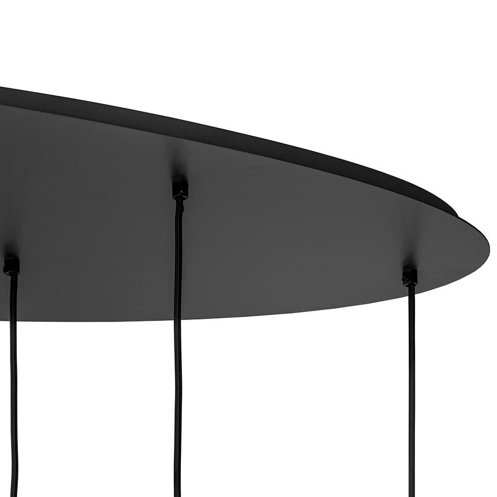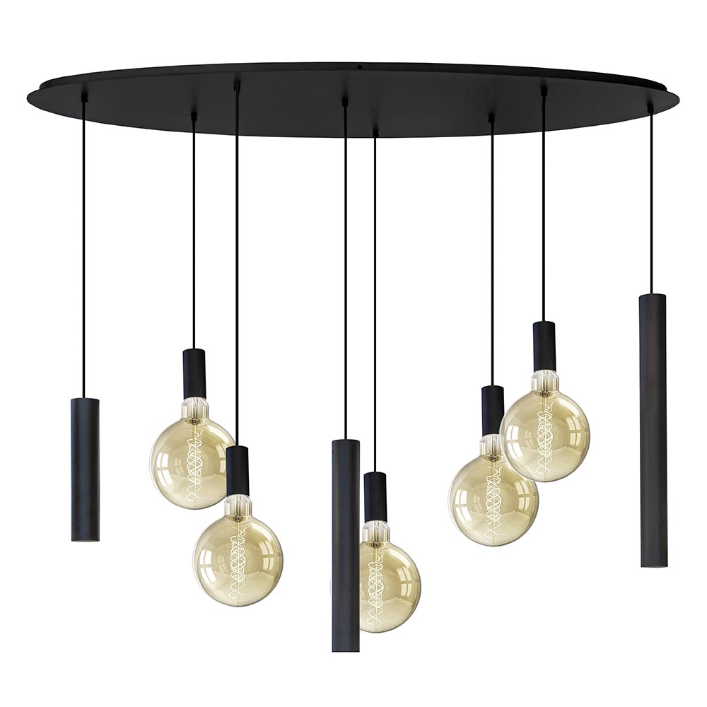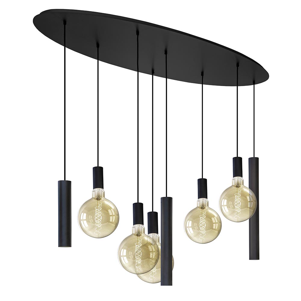 Deze prachtige hanglamp past perfect in een design of luxury interieur. De hanglamp is uitgevoerd in het zwart en voorzien van een grote ovale plaat van maar liefst 140 cm lang. Ideaal voor boven een ovale eettafel. De hanglamp heeft 8 lichtpunten waarvan er 5 een pendel met E27 fitting hebben en 3 een cilinder met een GU10 fitting. De cilinders hebben diverse afmetingen en zorgen dat er goed licht wordt verspreid op de ondergrond. De E27 pendels zorgen daarbij voor extra diffuus licht en sfeer. De ovale hanglamp is naar wens in hoogte te verdelen met een maximale hoogte van 125 cm. De designlamp wordt geleverd exclusief lichtbronnen!