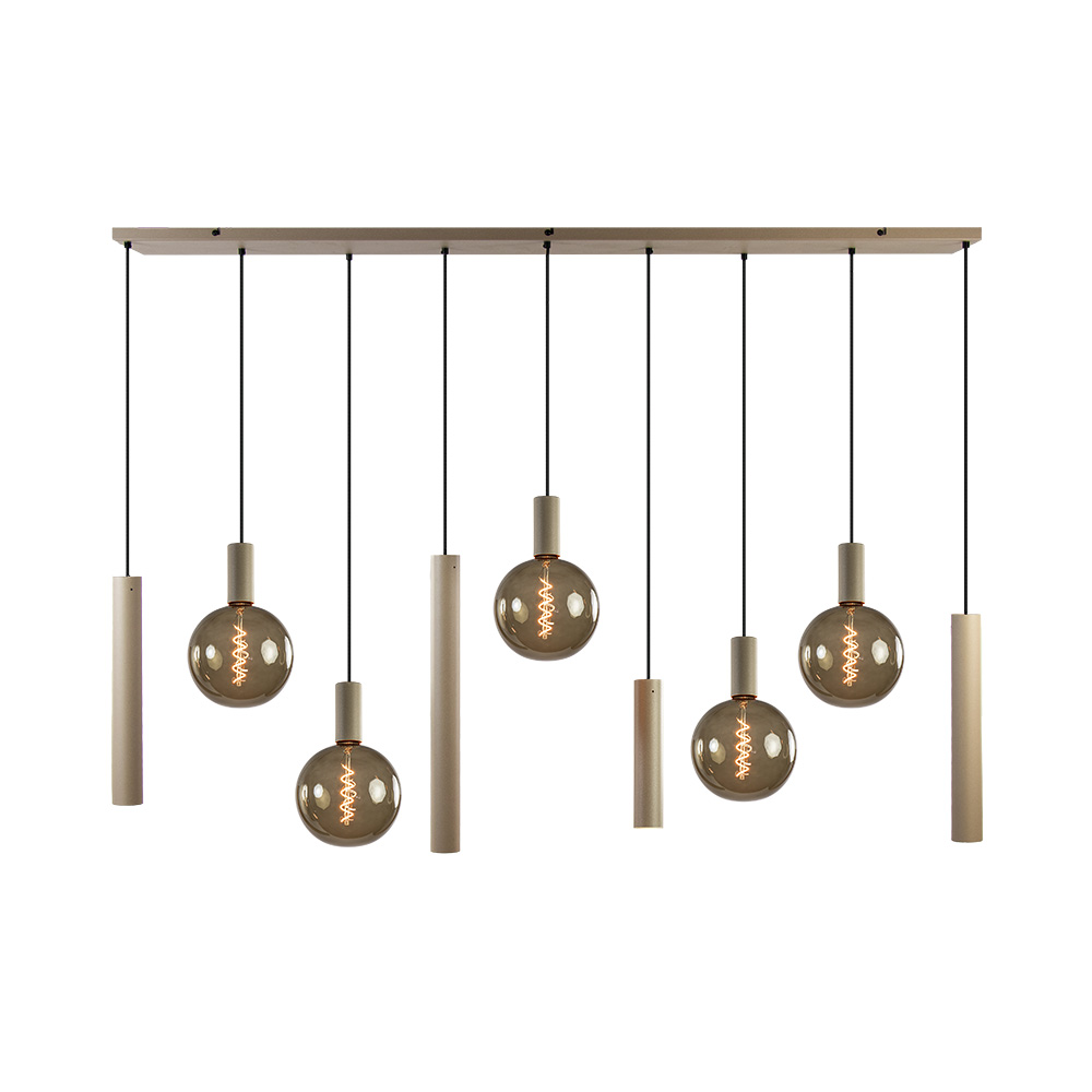 Deze prachtige hanglamp past perfect in een design of luxury interieur. De hanglamp is uitgevoerd in het quartz en voorzien van een grote rechthoekige plaat van 170 cm lang. Ideaal voor boven een eettafel. De hanglamp heeft 9 lichtpunten waarvan er 5 een pendel met E27 fitting hebben en 4 een cilinder met een GU10 fitting. De cilinders hebben diverse afmetingen en zorgen dat er goed licht wordt verspreid op de ondergrond. De E27 pendels zorgen daarbij voor extra diffuus licht en sfeer. De hanglamp is naar wens in hoogte te verstellen met een maximale hoogte van 130 cm. De designlamp wordt geleverd exclusief lichtbronnen!