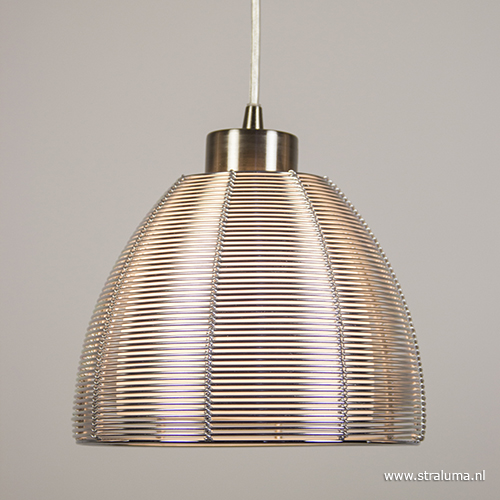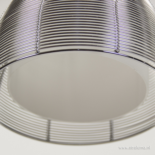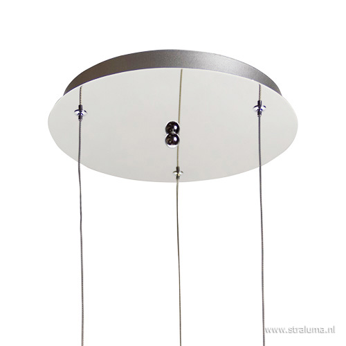 Deze moderne hanglamp is een leuke en mooie toevoeging aan het interieur. De kappen hebben een strak en modern design en geven ook nog eens een sfeervolle verlichting, ze bestaan namelijk uit een buitenkap van zilver metaaldraad en een binnenkap van wit melkglas die zorgt voor een zachte verlichting. Voordeel van het matglas aan de binnenzijde is dat er ook niet direct in de lichtbron kan worden gekeken. De kapjes zijn afgewerkt met een aluminium armatuur die door het transparante snoer wordt verbonden met de aluminium ronde plafondplaat. De 3-lichts hanglamp past mooi boven een ronde eettafel of salontafel.