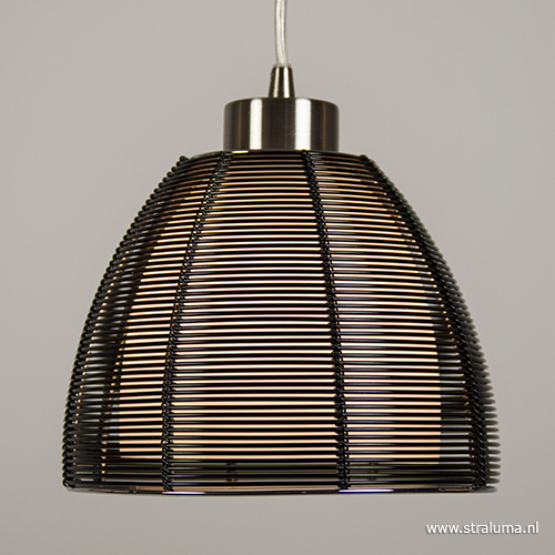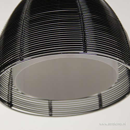 Deze moderne hanglamp is een leuke en mooie toevoeging aan het interieur. De kappen hebben een strak en modern design en geven ook nog eens een sfeervolle verlichting, ze bestaan namelijk uit een buitenkap van zwart metaaldraad en een binnenkap van wit melkglas die zorgt voor een zachte verlichting. Voordeel van het matglas aan de binnenzijde is dat er ook niet direct in de lichtbron kan worden gekeken. De kapjes zijn afgewerkt met een aluminium armatuur die door het transparante snoer wordt verbonden met de aluminium ronde plafondplaat. De 3-lichts hanglamp past mooi boven een ronde eettafel of salontafel.