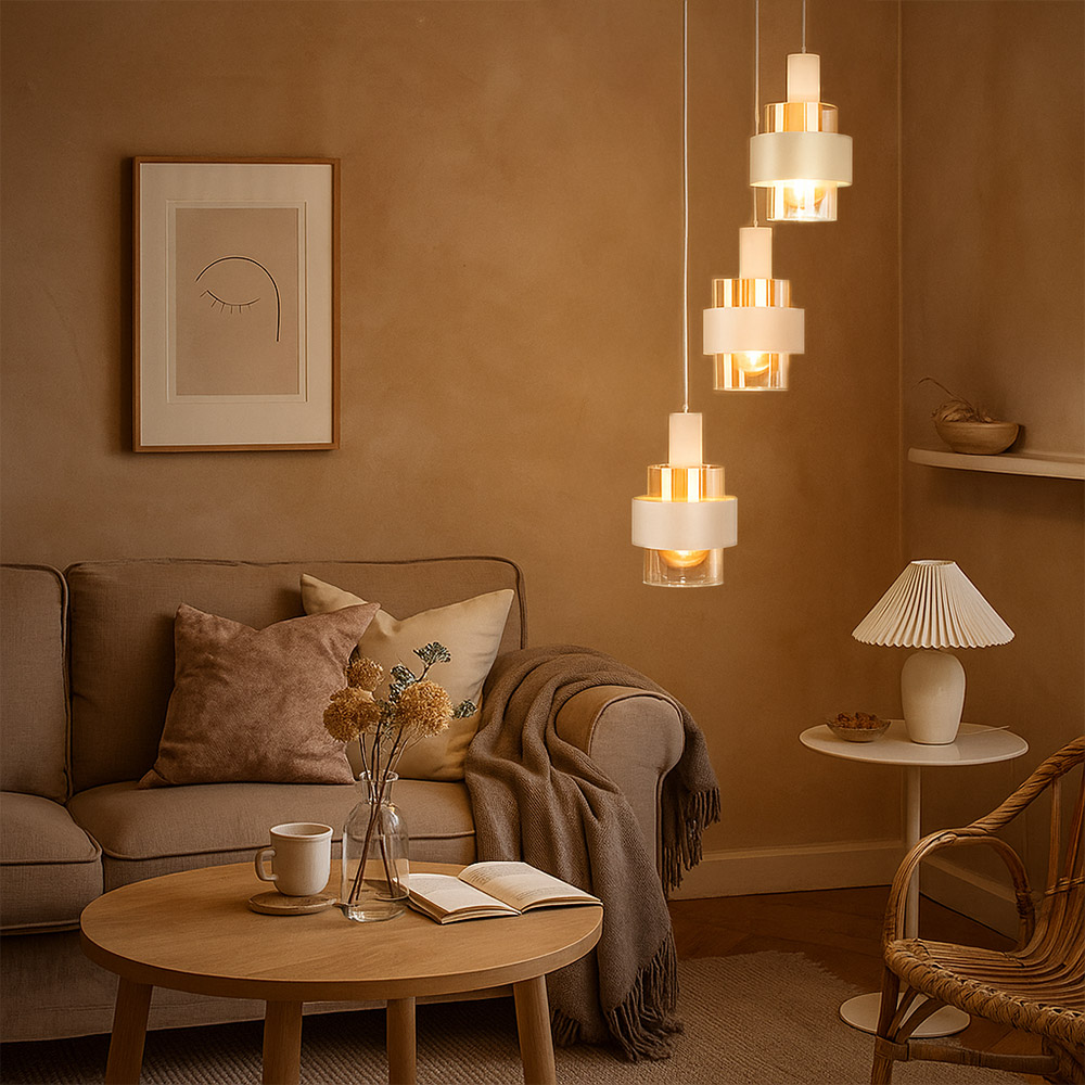 De Marrone 3-lichts hanglamp van Highlight brengt balans en elegantie in je interieur. Drie zandkleurige kappen hangen sierlijk naast elkaar aan een ronde plafondplaat en verspreiden een warm, zacht licht over de tafel. De combinatie van glas en metaal zorgt voor een moderne, maar huiselijke uitstraling.