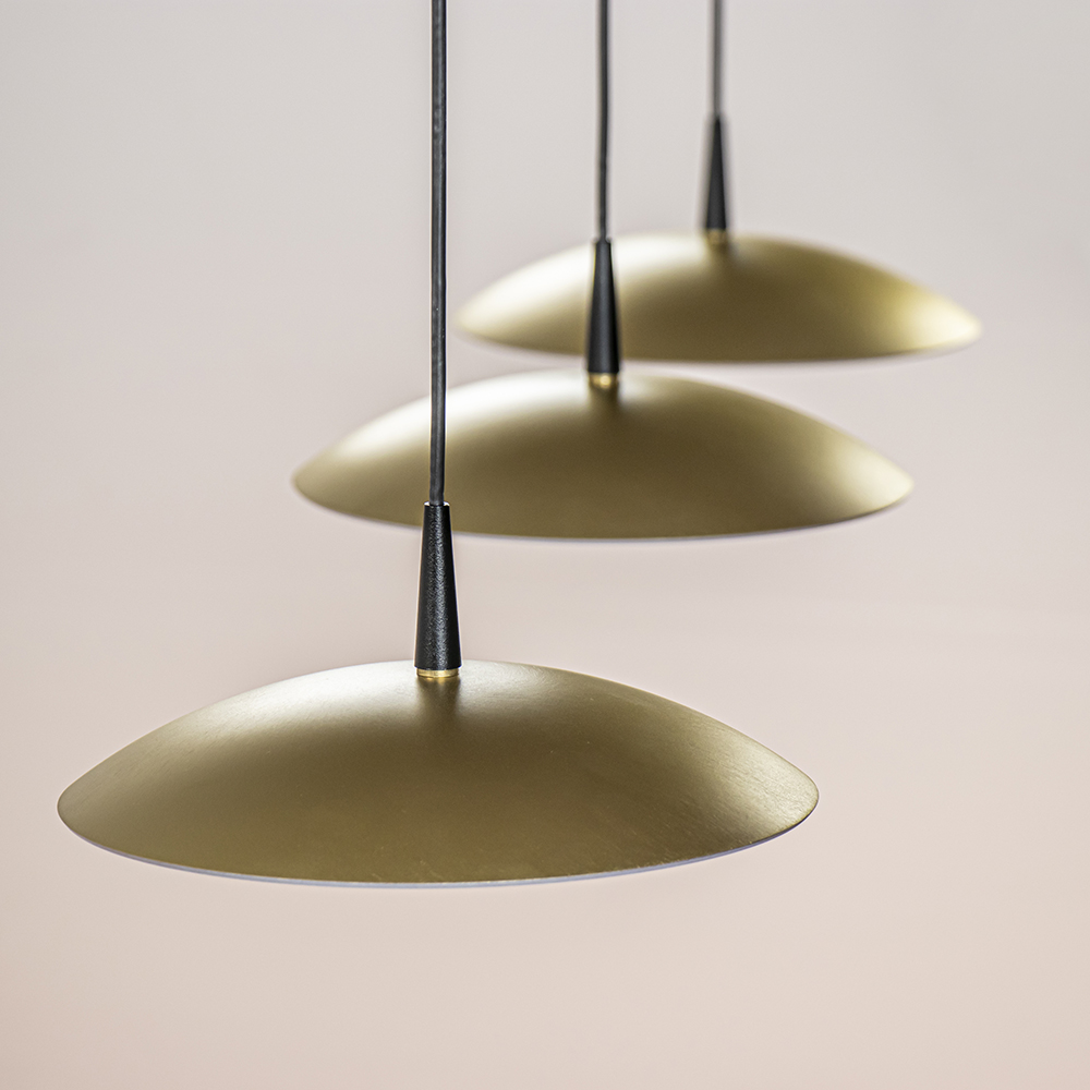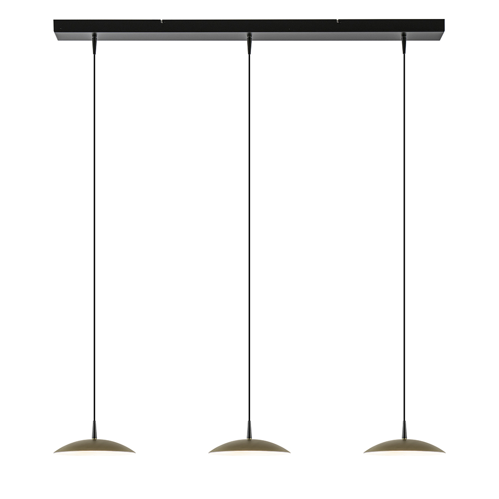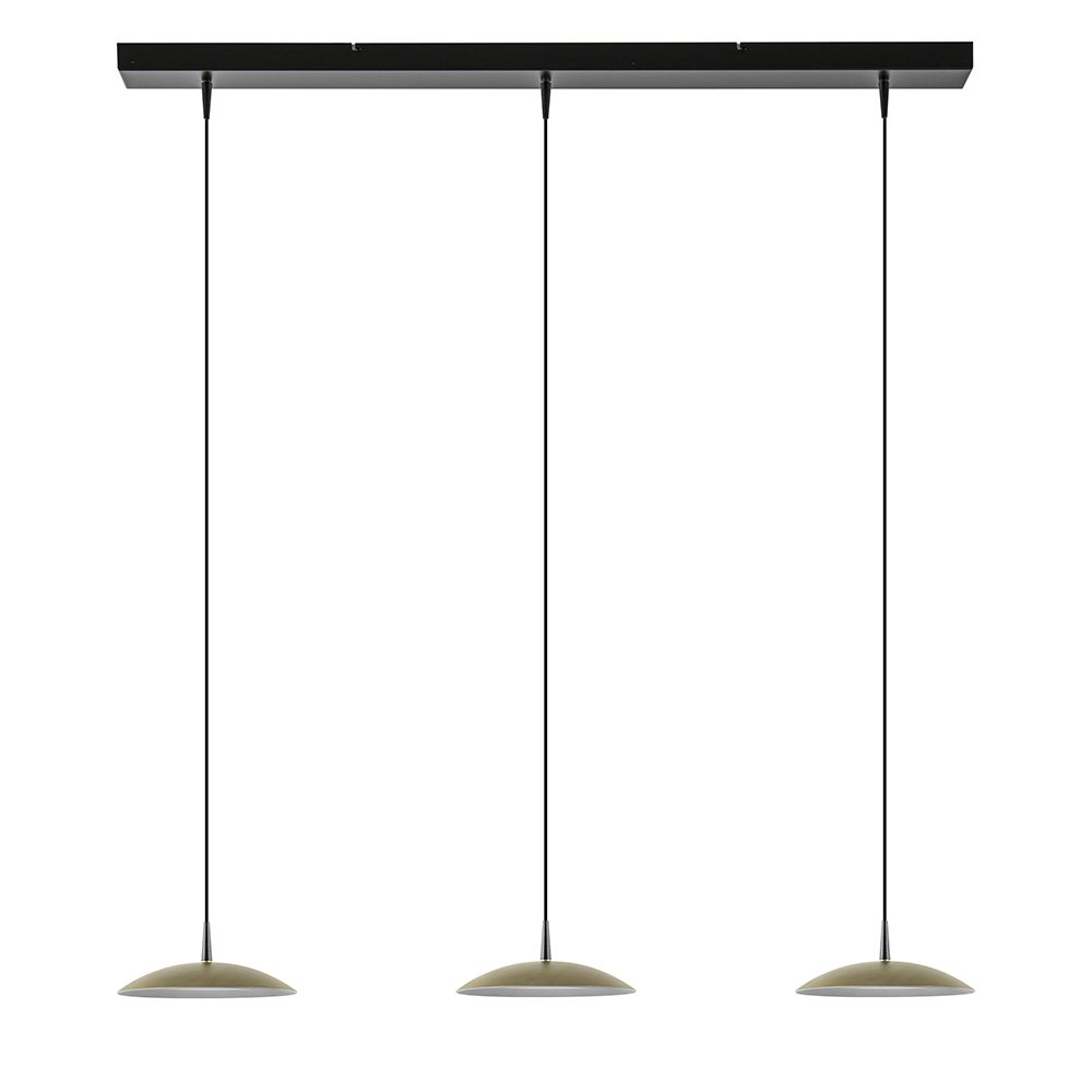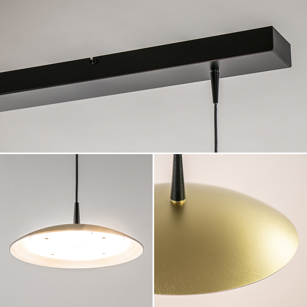 Een simplistisch design, maar een groots effect. Deze design hanglamp is voorzien van metalen schotels die zijn uitgevoerd in het mat goud. Dit combineert mooi met het mat zwarte armatuur. De schotels zijn ieder voorzien van een LED lichtpunt en zijn naar wens op hoogte te hangen. De LED hanglamp is dimbaar middels een externe dimmer en dimt ook in kleur (dim to warm). De hanglamp mat zwart met mat goud past mooi in een design of strak klassiek interieur boven de eettafel.