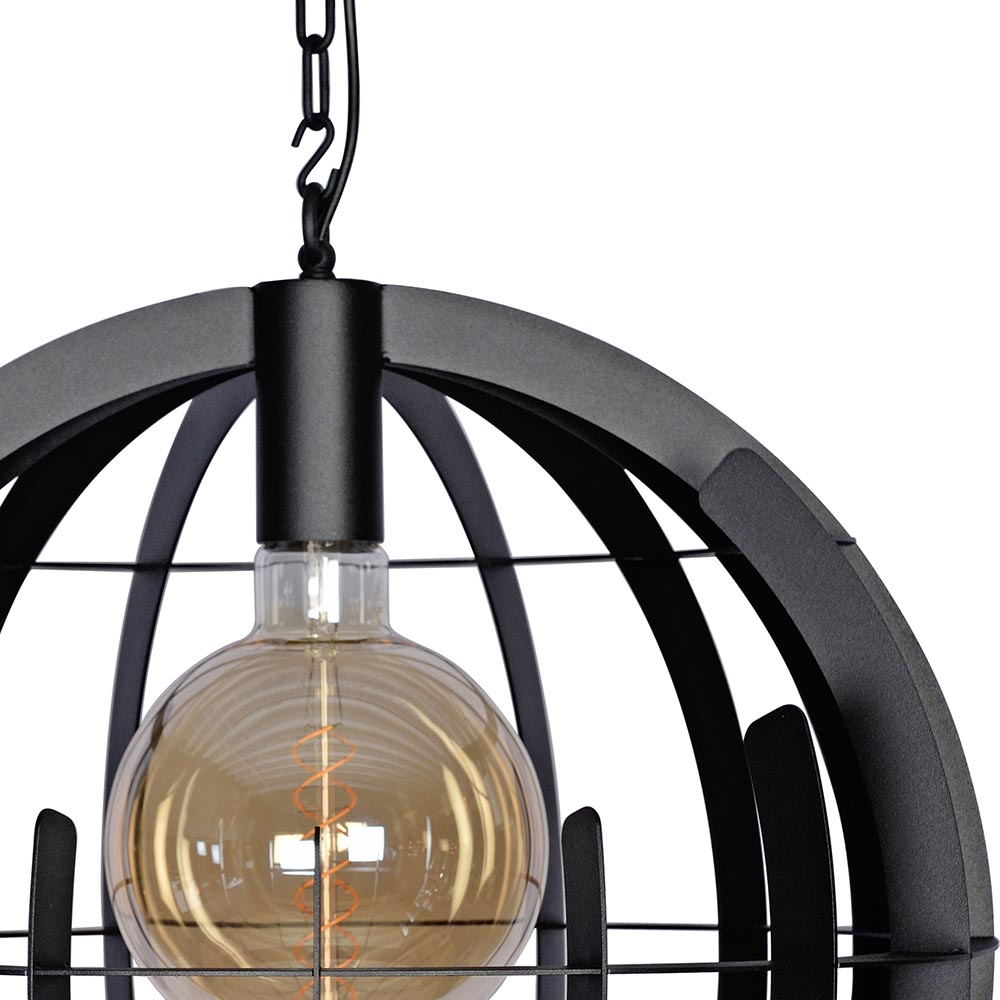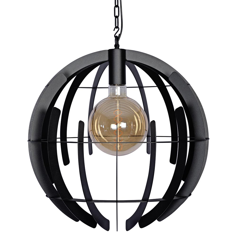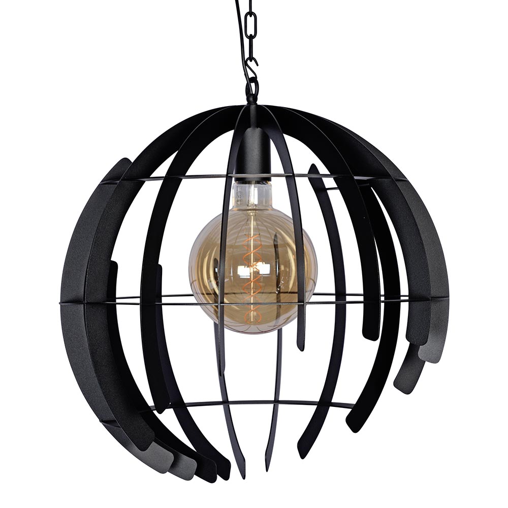 De grote bol is gemaakt van metalen ribben. Uit de bol zijn 2 cirkels weggelaten wat de lamp een speels a-symmetrisch uiterlijk geeft. Van elke zijde ziet deze hanglamp er dus anders uit! De zwarte afwerking is glad en geeft de lamp een modern uiterlijk. Door zijn grootte van 60 cm doorsnede past de zwarte bol mooi boven een grote ronde tafel.