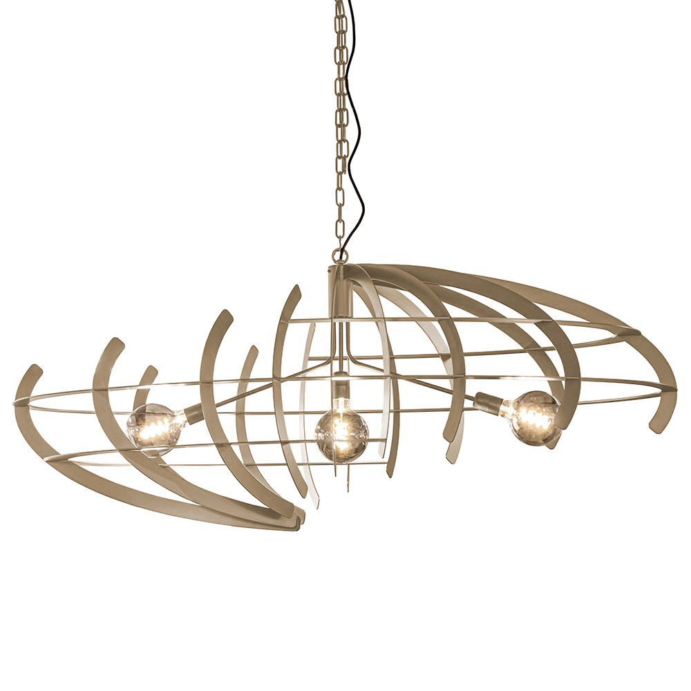 De Terra van Ztahl is een opvallende design hanglamp met een elegante ovale vorm. Deze 3-lichts lamp in de kleur Quartz is vervaardigd uit metalen ribben, waardoor het licht subtiel wordt verspreid en de lamp vanuit elke hoek een ander karakter laat zien. De open structuur zorgt voor een luchtig en grafisch effect boven je eettafel — perfect als stijlvolle blikvanger in een modern of industrieel interieur.