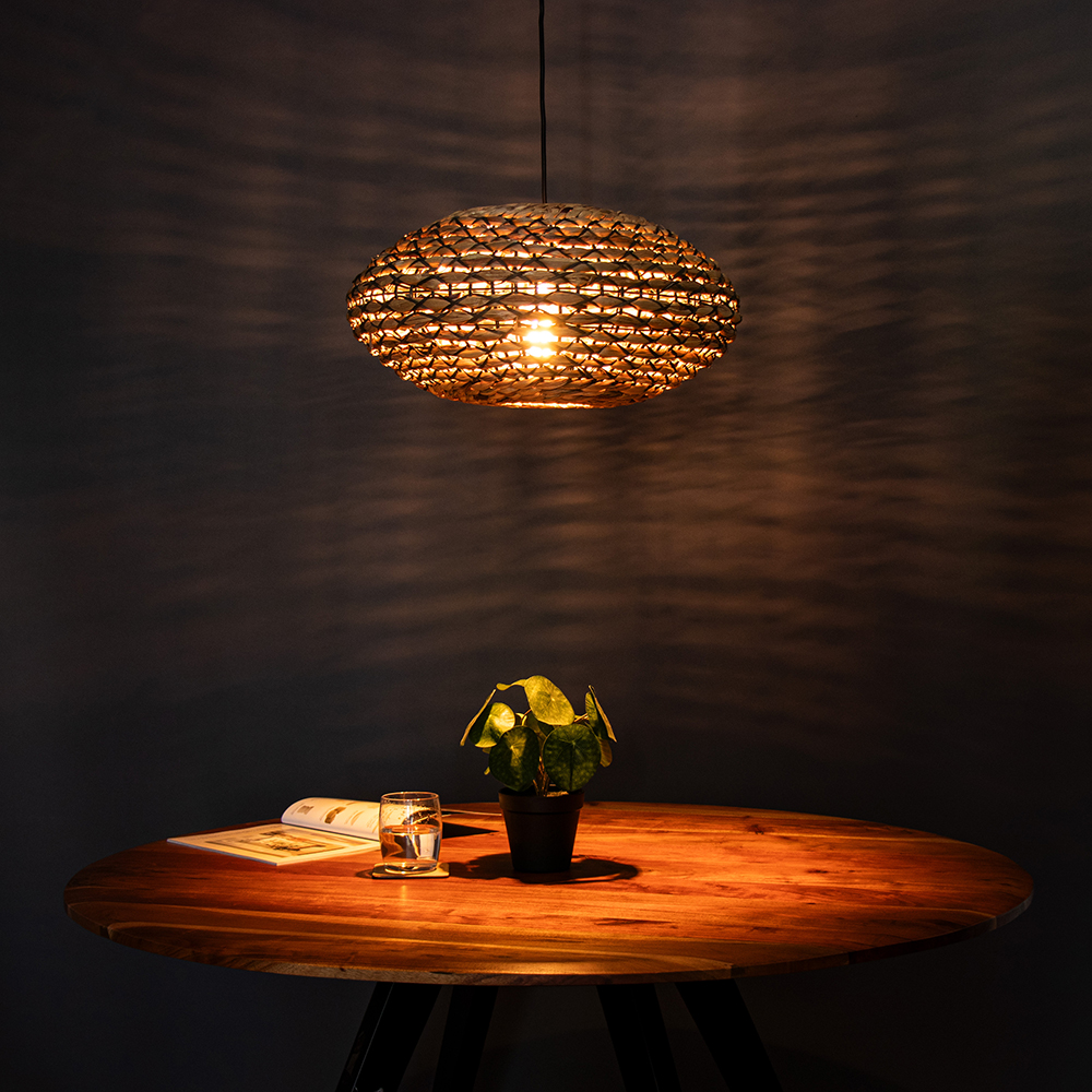 Deze leuke hanglamp van Light & living is een mooie toevoeging aan het interieur. De ronde lamp is gemaakt van gevlochte rattan wat rust op een metalen frame. De natuurlijke kleur van het rattan wordt opgebroken door het zwarte rattan wat door de lamp heen gevlochten is voor een speelser effect. De hanglamp is in hoogte te verstellen tot max 155 cm en heeft een gewicht van 1,9 kg.