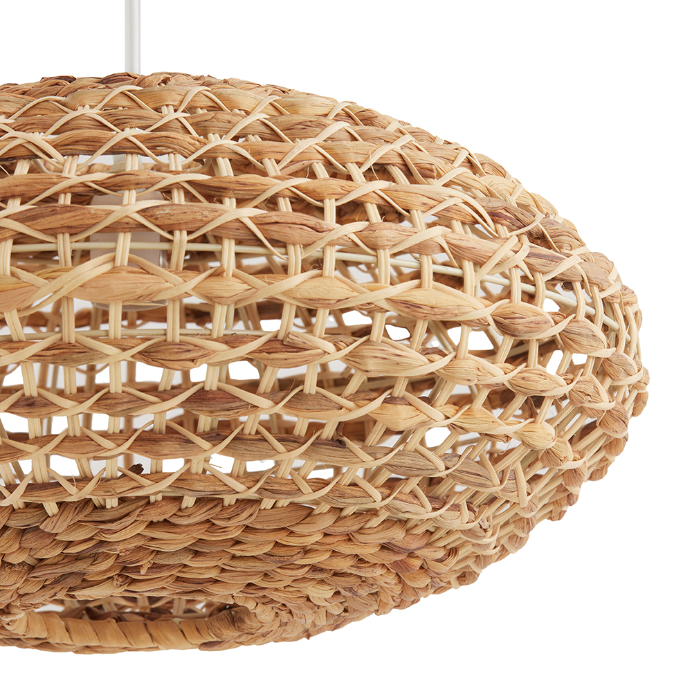 Details: – Afmetingen: ø60 x 155 cm – Kap: ø60 x 29,5 cm – bevestiging: ø12 x 2,6 cm – Snoer lengte: 155 cm – Schakelaar: 42 cm – Materiaal: Rattan & metaal – Kleur: Naturel & wit – Gewicht: 2,8 kg – In hoogte verstelbaar – Fitting: E27 (excl.)