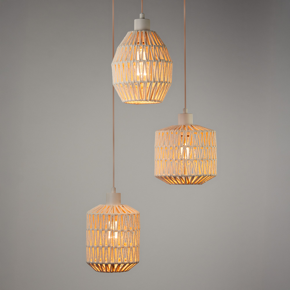 Waarom kiezen voor deze lamp? • Uniek design: Drie verschillende kapvormen voor een speels effect. • Sfeervol: Open structuur voor een prachtig lichtspel. • Breed toepasbaar: Perfect voor bohemian, coastal, Scandinavische en Japandi interieurs.