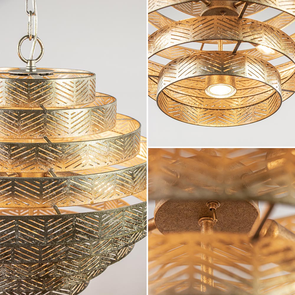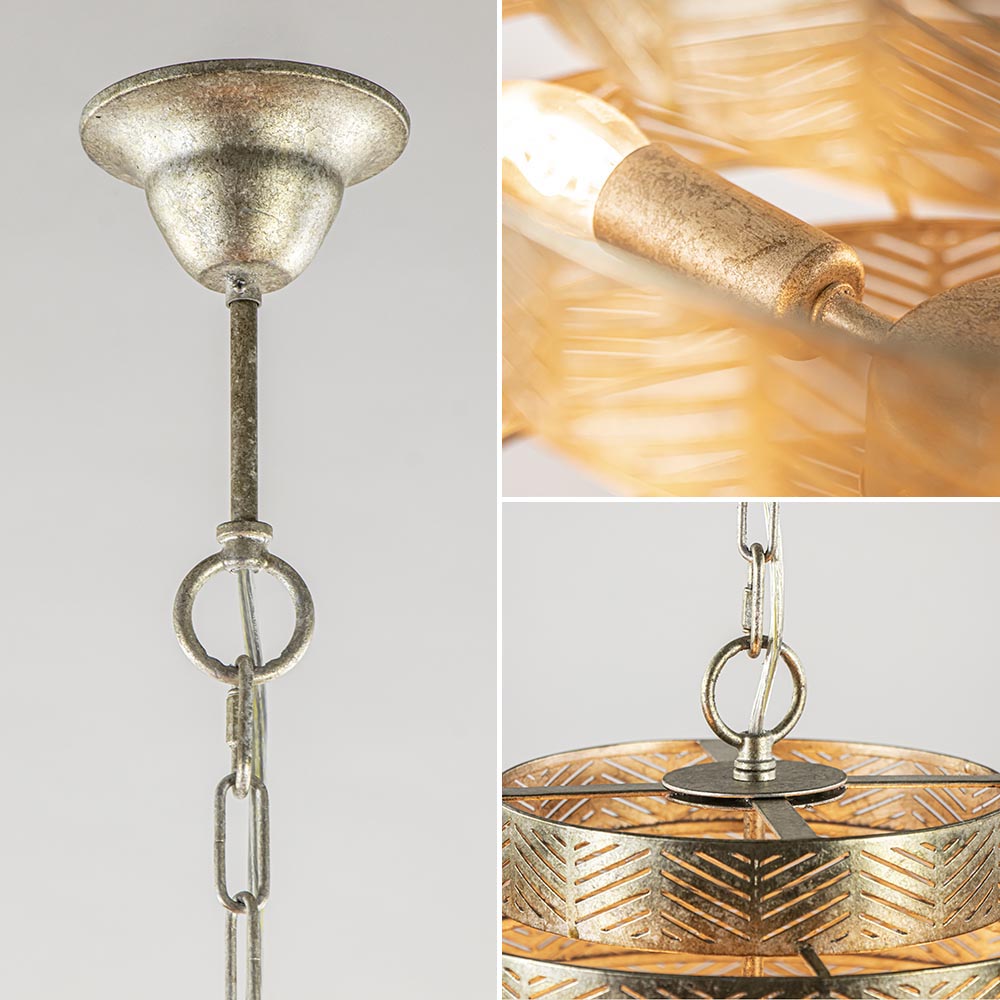 Deze prachtige hanglamp maakt het interieur helemaal af. De lamp is volledig gemaakt van metaal en uitgevoerd in ambachtelijk zilver. Dit geeft de lamp een robuuste look die wordt versterkt door de bewerking in het metaal. De kap is opgebouwd uit losse ringen die met elkaar zijn verbonden en de kap hangt aan een stevige ketting die in dezelfde kleur als de kap is uitgevoerd. Binnenin de kap is de lamp voorzien van 4 lichtpunten met een E14 fitting. Hierdoor verspreid de lamp een goede lichtopbrengst. Daarnaast is de kap aan de onderzijde nog voorzien van een extra GU10 spot die het oppervalkte onder de lamp goed uitlicht. Deze spot is dmv de schakelaar op het armatuur apart te bedienen van de andere verlichting. De robuuste zilveren hanglamp staat stijlvol boven een ronde eettafel, in de hal of in een slaapkamer. De ronde hanglamp is dimbaar middels een externe dimmer (exclusief)