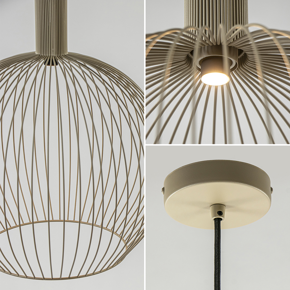 Deze trendy draad hanglamp is een mooie toevoeging aan het interieur. De ronde hanglamp is gemaakt van metaal en voorzien van een finish in de kleur mat zand. Dit geeft de lamp een trendy en Scandinavische look en feel die mooi matcht in diverse woonstijlen. De ronde draadkap hangt aan een zwart stof omwonden snoer die naar wens is in te korten. De maximale hoogte van de lamp is 190 cm. Door de open constructie van de hanglamp bepaald de lichtbron veelal de sfeer. Kies voor de kleine spot Pucc (art: 05320014) waardoor de aandacht volledig naar de lamp gaat of een grote decoratieve lichtbron die de lamp complementeert. De draad hanglamp is dimbaar middels een externe dimmer (exclusief).