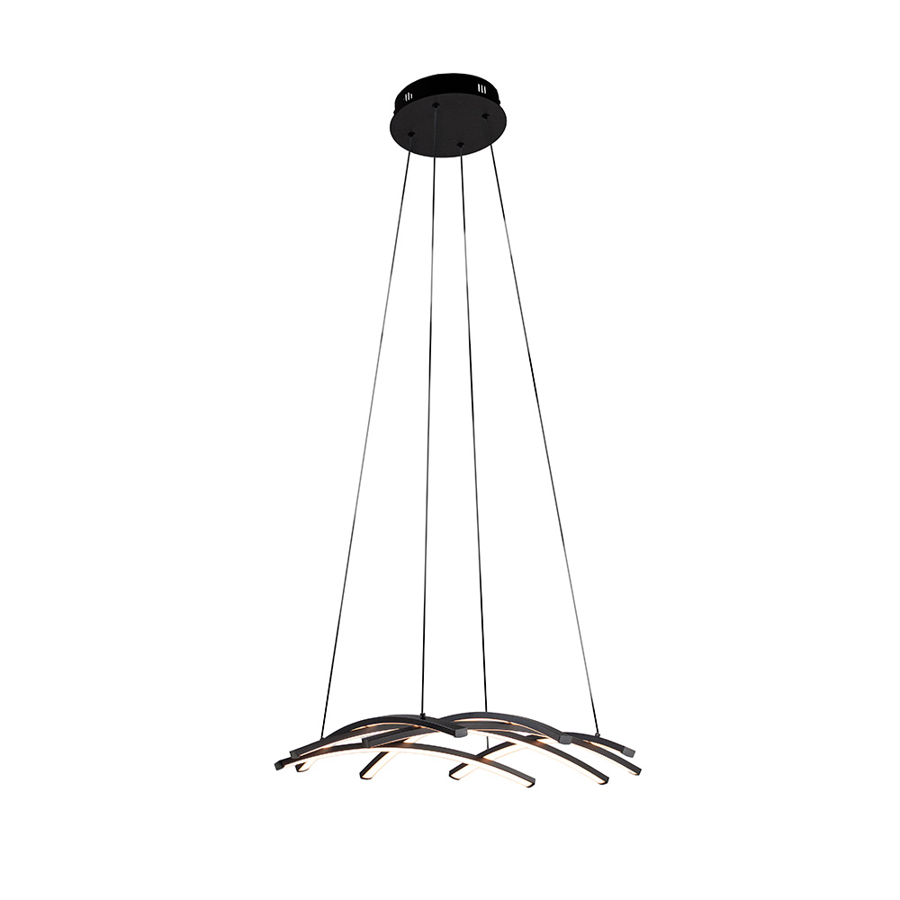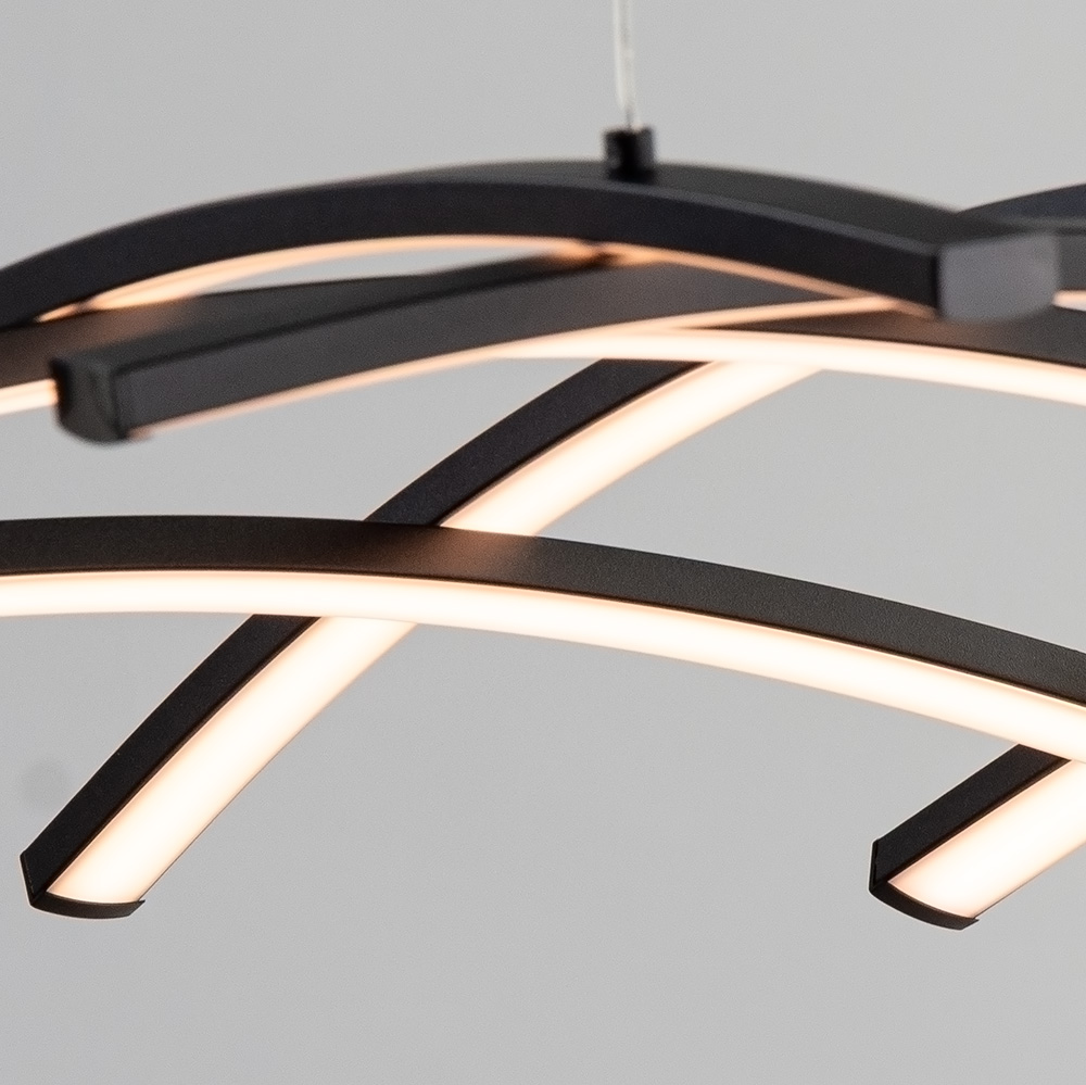 Belangrijkste kenmerken: Sculpturale hanglamp met meerdere gebogen lichtlijnen Kleur: matzwart Geïntegreerde LED-verlichting (warm wit) Energiezuinig en onderhoudsarm Hoogte verstelbaar tijdens installatie