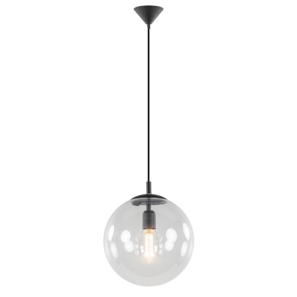 Modern en retro in één. Deze hanglamp bol voldoet aan meerdere stijlen. De hanglamp heeft een helder glazen bol van 30 cm welke wordt bevestigd op een metalen fitting. De helder glazen bol hangt een aan zwart snoer en is naar wens in te korten. De maximale hoogte van de lamp is 250 cm. De retro hanglamp wordt aan het plafond opgehangen met een kunststof bevestiging en geleverd exclusief lichtbron (E27).