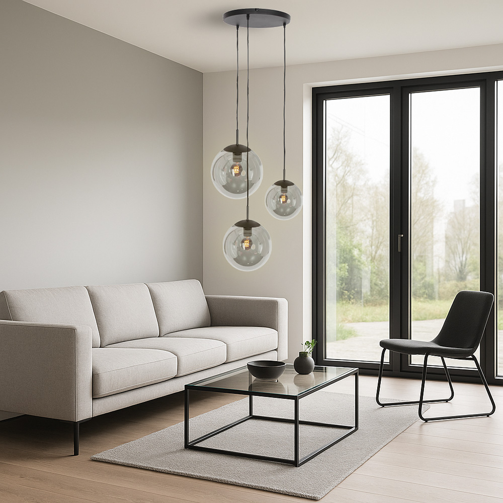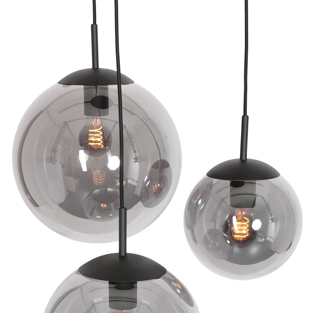 Deze stijlvolle 3-lichts hanglamp combineert modern design met een warme, sfeervolle uitstraling. De ronde glazen bollen in smoke kleur zorgen voor een subtiel getint licht en creëren een elegant effect boven bijvoorbeeld een eettafel of zithoek. De zwarte metalen details en ronde plafondplaat geven het armatuur een strakke afwerking en zorgen voor een stoer accent. De glazen bollen hangen op verschillende hoogtes voor een speels ruimtelijk effect. Perfect voor een eigentijds interieur waarin design en sfeer hand in hand gaan. De lamp komt het best tot zijn recht met decoratieve filament lichtbronnen (niet inbegrepen).