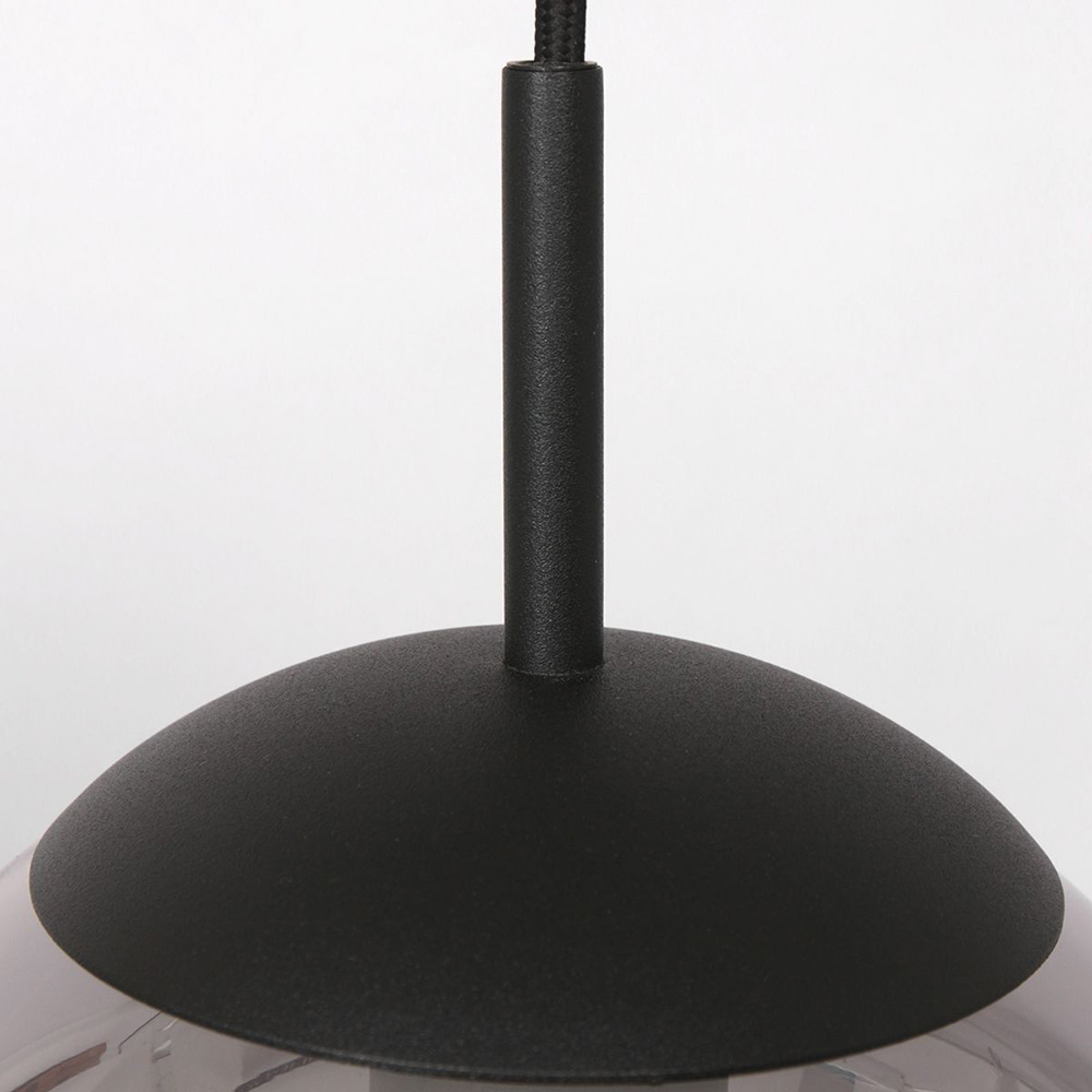 Kenmerken: 5 glazen bollen van rookglas in verschillende formaten Zwart metalen armatuur met langwerpige plafondplaat Ideaal voor boven eettafels of in hoge ruimtes zoals een trappenhal Geschikt voor E27 lichtbronnen (niet inbegrepen) Snoeren in hoogte verstelbaar bij installatie