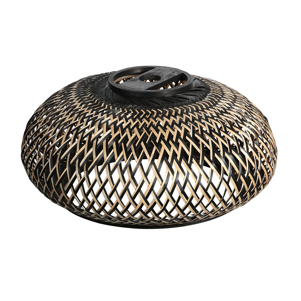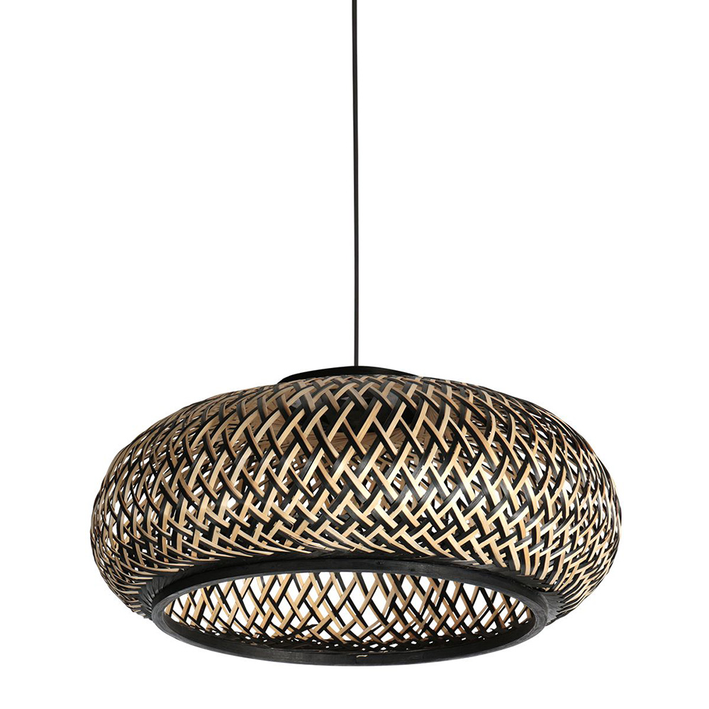 Breng warmte en karakter in je interieur met deze sfeervolle hanglamp in zwart-naturel gevlochten bamboe. De organische vormen en het ambachtelijk geweven patroon zorgen voor een prachtig lichtspel op de muur en het plafond zodra het licht aangaat. Deze lamp is de perfecte mix van natuurlijke materialen en modern design, ideaal voor boven de eettafel, in de woonkamer of als eyecatcher in de hal.
