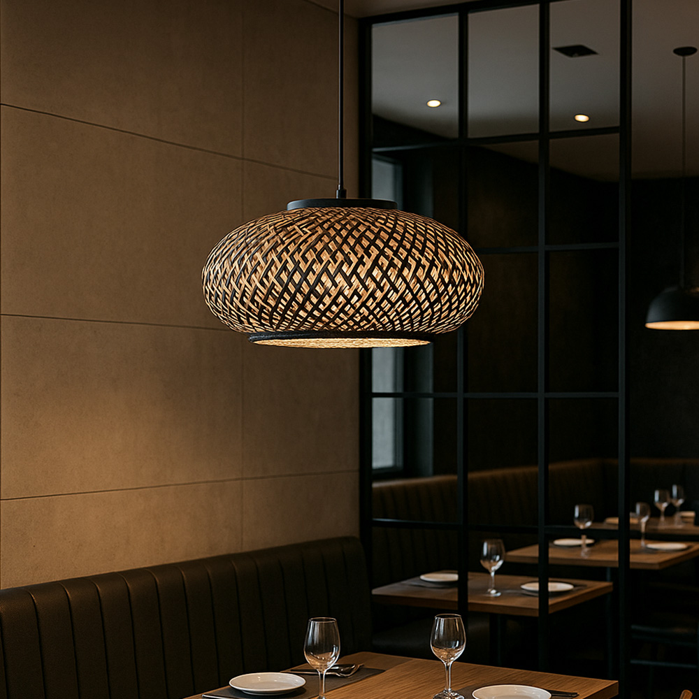 De zwart metalen ophanging geeft een stoer accent, terwijl het gevlochten bamboe een zachte en uitnodigende uitstraling biedt. Dankzij de neutrale kleurstelling past deze hanglamp moeiteloos in zowel Scandinavische, landelijke als boho interieurs.