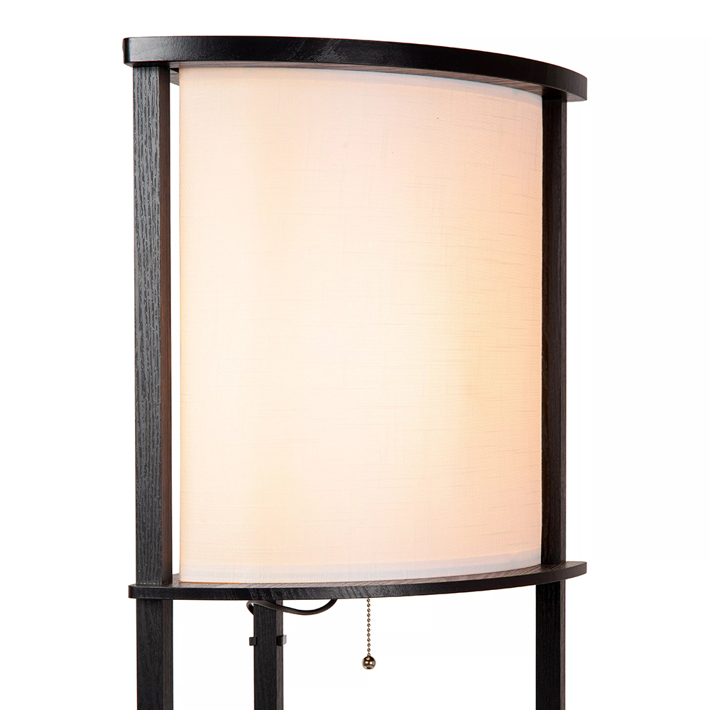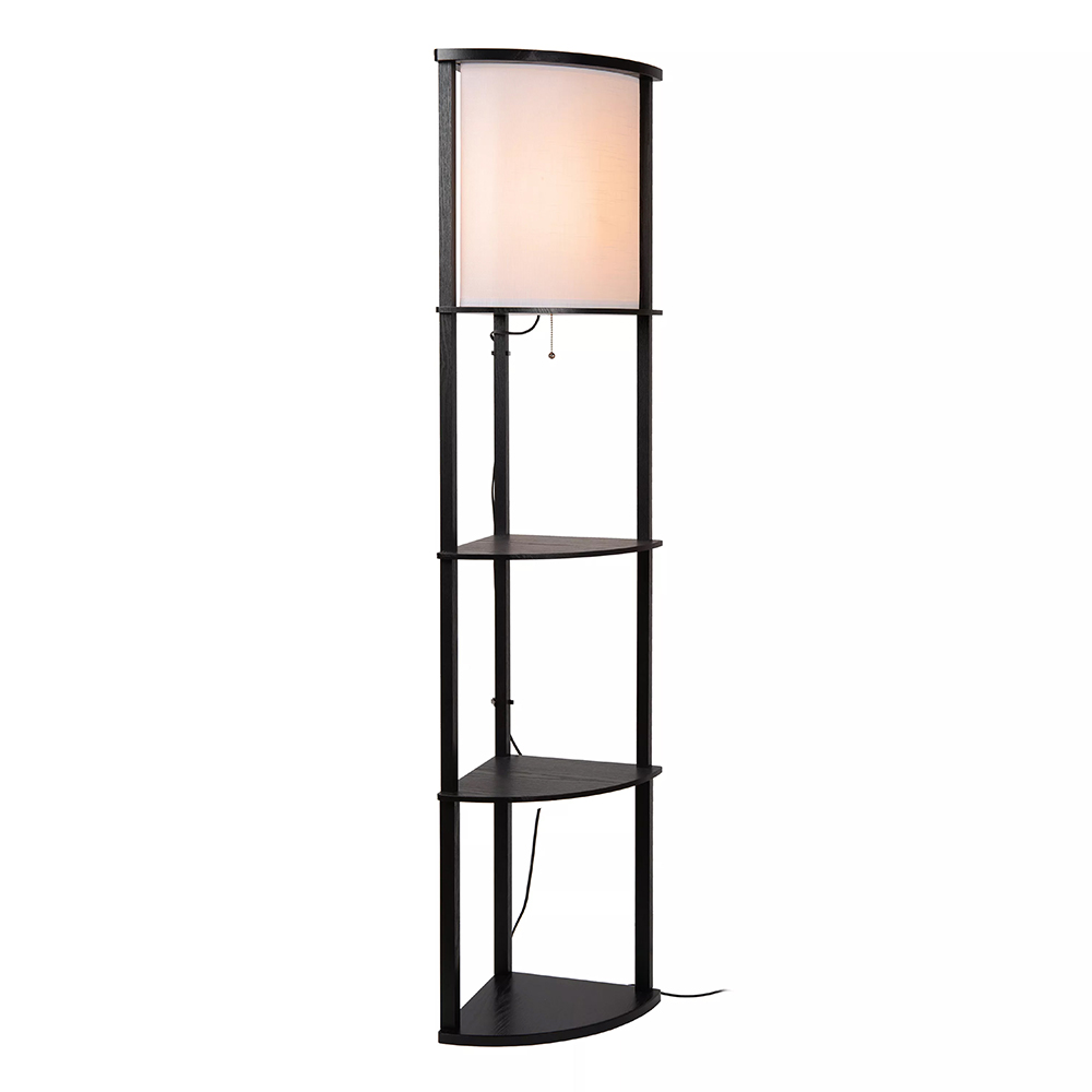 Deze sfeervolle vloerlamp is gemaakt van hoogwaardig mdf en uitgevoerd in het mat zwart. Dit is mooi gecombineerd met een beige kantoenen kap die zorgt voor diffuus licht in de ruimte. Door de driehoekige vorm is de vloerlamp perfect toe te passen in een lege hoek in de kamer. De plankjes zijn prima geschikt om wat leuke accessoires, plantjes of boeken op neer te zetten. De zwarte vloerlamp met kap is voorzien van een snoer met een lengte van 180 cm en wordt gemakkelijk aan en uit geschakeld dmv de nostalgische trekschakelaar onder de kap.