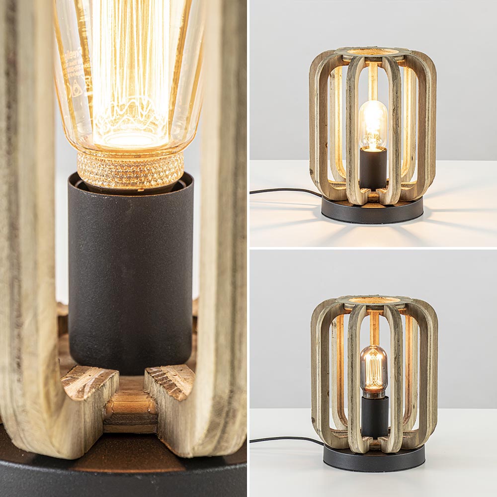 Een leuke sfeermaker voor in een kast of op een bijzettafel. Deze kleine tafellamp heeft een stoer karakter die mooi is te combineren in een industrieel of landelijk interieur. De houten kooi heeft een ruwe afwerking die is gecombineerd met een mat zwarte voet en fitting. De combinatie van de materialen is perfect uitgevoerd en maakt een mooi geheel. De houten tafellamp is voorzien van een zwart stof omwonden snoer met een lengte van 150 cm. De knipschakelaar bevindt zich op 40 cm in het snoer. De industriële tafellamp houten kooi met mat zwart wordt geleverd zonder lichtbron. Een decoratieve bron past mooi in de open kooi.