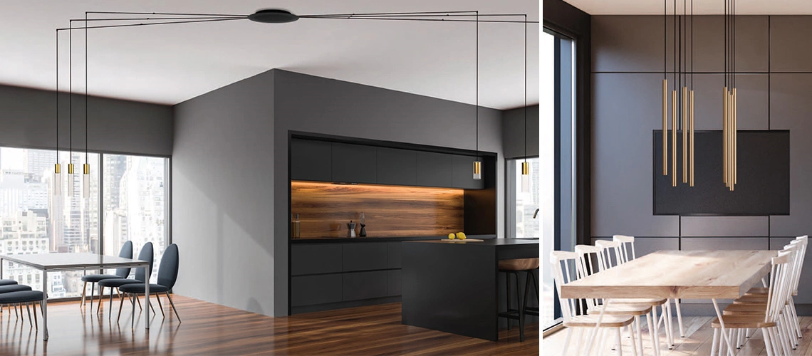 Voor de platen van de NOVO serie geldt dat je vrij bent in je keuze over de hoeveelheid snoeren en lichtpunten aan de balk of plaat (met een maximum van 12). Naast de platen is er ook de zogenaamde kabelsteun. Hiermee kun je de lamp op ieder gewenst punt ophangen. Zo is het geen probleem dat de eettafel niet precies onder het lichtpunt staat. Maar het is ook mogelijk om vanuit 1 plafondplaat de lampen in de keuken én boven de eettafel te hangen.
