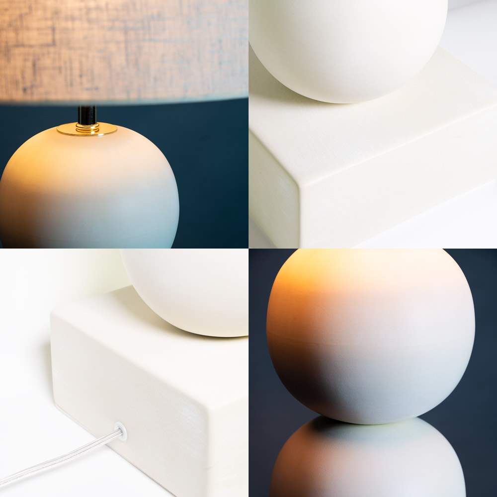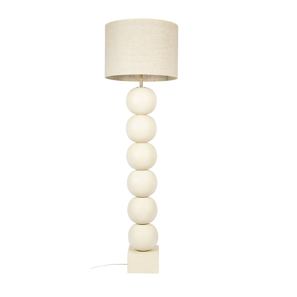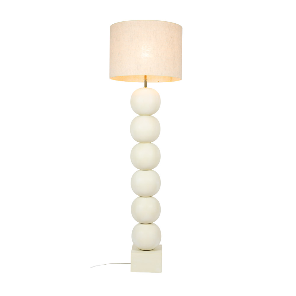 Highlights • Keramische vloerlamp met gestapelde, ronde bollen • Matte afwerking in gebroken wit voor een rustige uitstraling • Kantelbare kop voor het gericht instellen van het licht • Grote stoffen kap voor warm en diffuus sfeerlicht • Geschikt voor E27 lichtbron