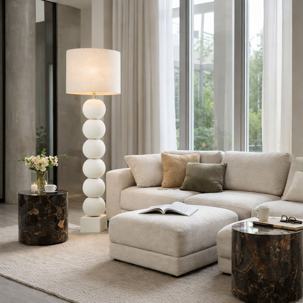 Deze keramische vloerlamp is een elegante sfeermaker voor de woonkamer, leeshoek of naast een fauteuil. De hoge voet met gestapelde bollen geeft de lamp een sculpturale uitstraling, terwijl de matte afwerking zorgt voor een zacht en tijdloos karakter. Dankzij de kantelbare kop richt je het licht eenvoudig naar wens, en de royale stoffen kap verspreidt het licht gelijkmatig door de ruimte.