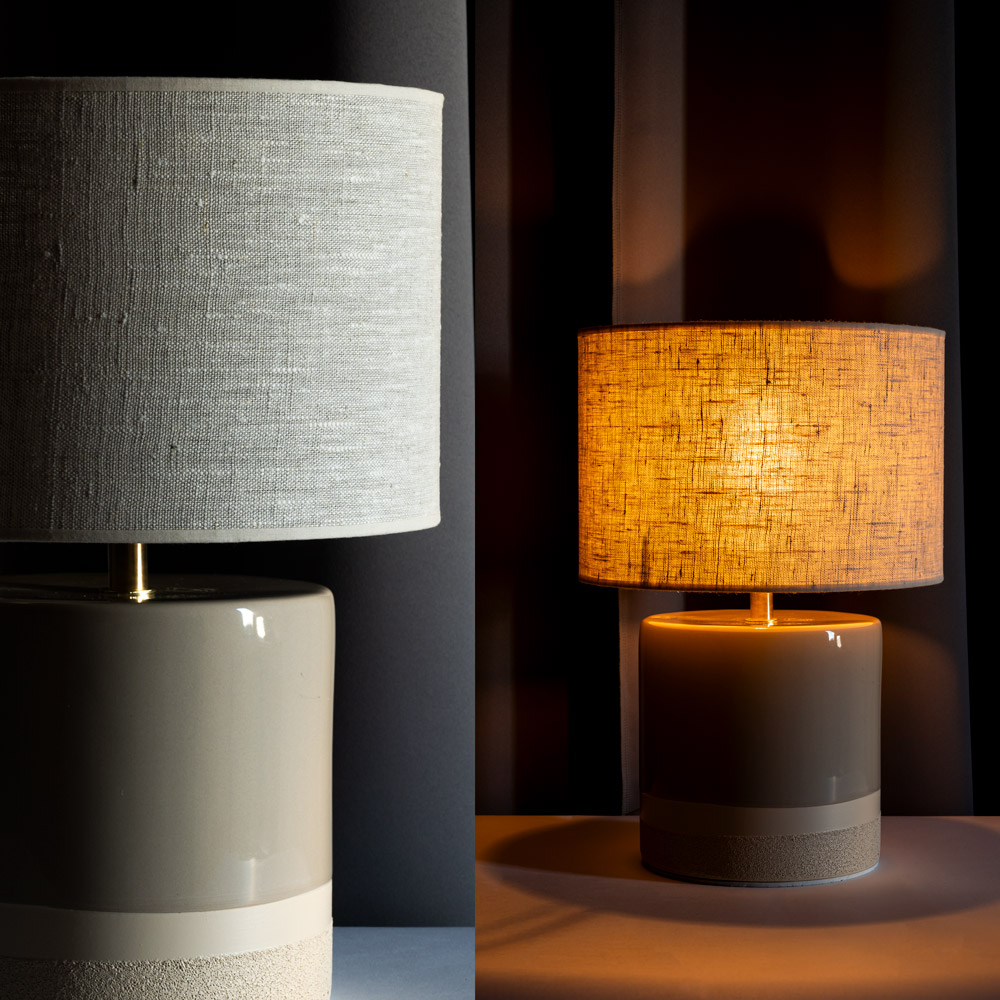 Highlights • Compacte keramische tafellamp met zachte vormen • Verschillende keramische afwerkingen voor een verfijnde uitstraling • Kantelbare kop voor het gericht afstellen van het licht • Stoffen kap voor warm, diffuus sfeerlicht • Snoerlengte 150 cm