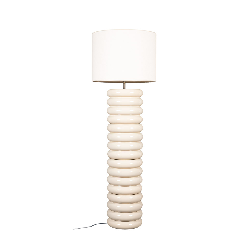 Highlights • Keramische vloerlamp met gestapelde schijvenvoet • Glanzend glazuur voor een luxe uitstraling • Taupe keramiek met gebroken witte stoffen kap • Kantelbare kop voor het richten van het licht • E27 fitting – kies zelf de lichtbron • Snoerlengte 150 cm