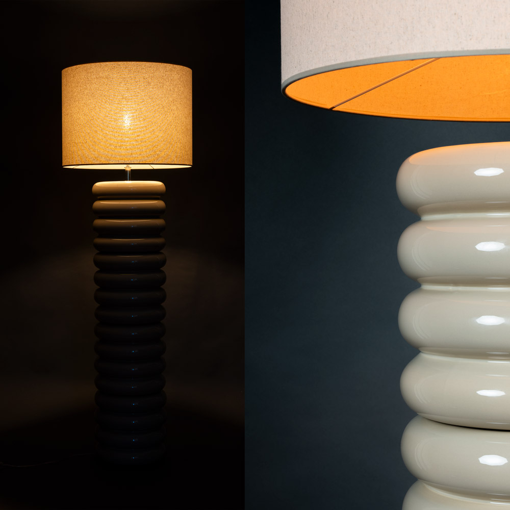 Specificaties • Producttype: Vloerlamp • Kleur: Taupe / gebroken wit • Materiaal: Keramiek met glanzend glazuur, stoffen kap • Afmetingen: H 155 × Ø 50 cm • Lichtbron: 1× E27 (max. 7 watt, niet inbegrepen) • Snoerlengte: 150 cm