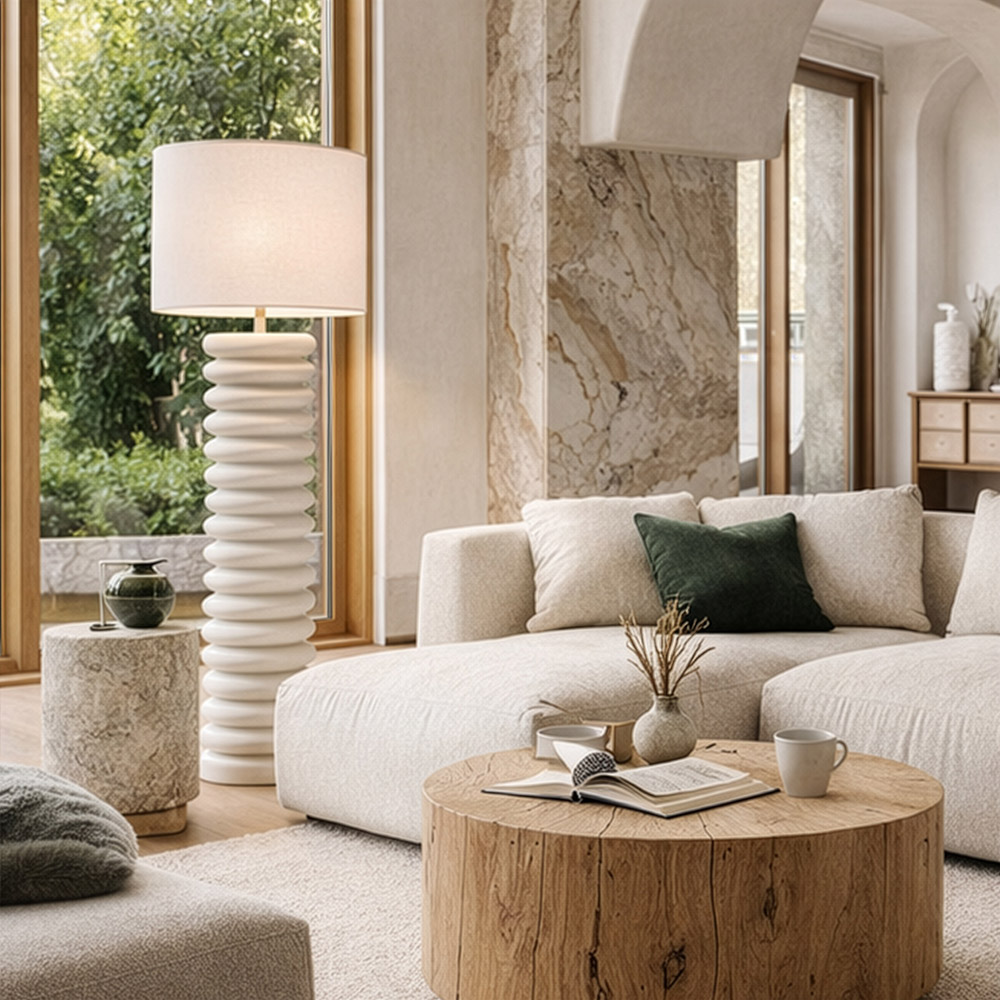 Deze keramische vloerlamp is een stijlvolle sfeermaker voor de woonkamer, slaapkamer of leeshoek. De voet bestaat uit keramische schijven met een glanzende afwerking, wat zorgt voor een rustig maar uitgesproken design. Dankzij de kantelbare kop kun je het licht eenvoudig richten, terwijl de stoffen kap het licht zacht en gelijkmatig verspreidt.