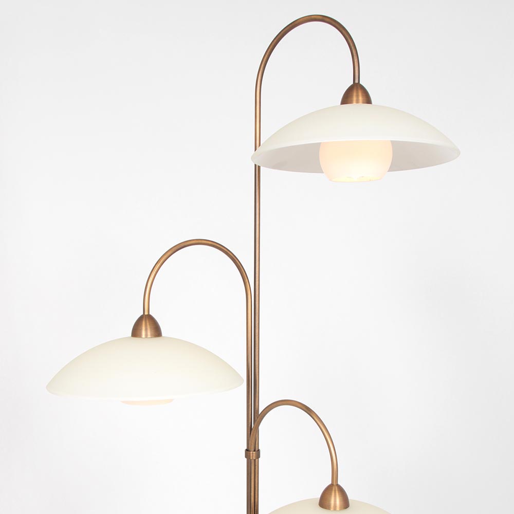 Perfect geschikt voor een klassiek of strak klassiek interieur. De 3-lichts vloerlamp is vervaardigd uit bronskleurig staal en mooi gecombineerd met creme glazen schotels. Het witte bolletje onder de schotel zorgt ervoor dat u niet direct in de lichtbron kunt kijken en tevens voor sfeervol diffuus licht. De vloerlamp is voorzien van LED en geeft met 2700 Kelvin mooi warm wit licht. Daarnaast beschikt de lamp over een dimmer zodat u gemakkelijk de juist sfeer kunt creëren. De klassieke vloerlamp wordt geleverd inclusief bronskleurig snoer.