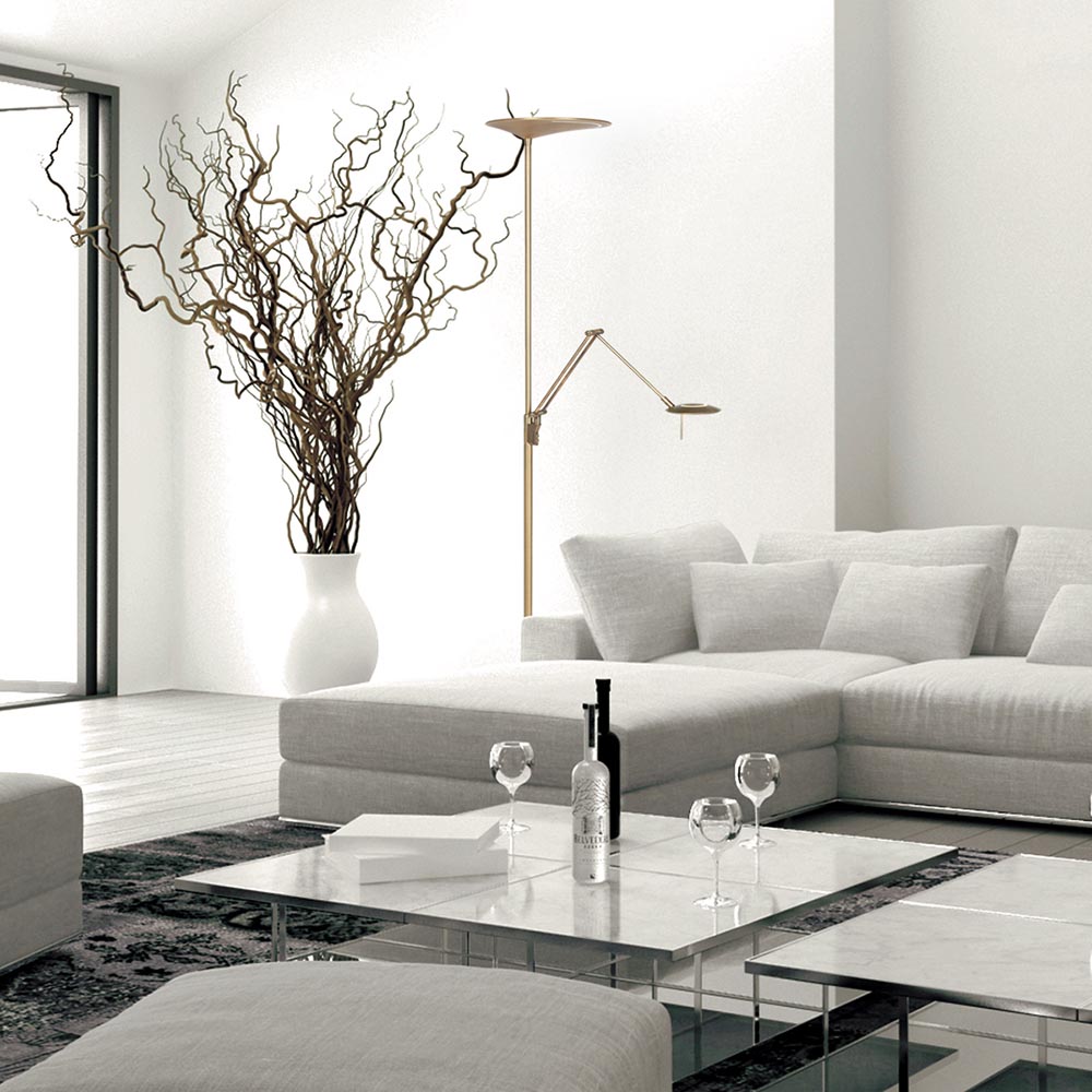 Deze klassieke vloerlamp is een multifunctionele lamp. De lamp is voorzien van een uplighter en een leeslamp die beide los van elkaar zijn te bedienen. De vloerlamp is uitgevoerd in het brons en voorzien van LED verlichting. Beide hebben een warm witte verlichting van 2700 Kelvin en zijn te dimmen d.m.v de pushdimmers op het armatuur. De leeslamp is naar wens te verstellen zodat u niet heel de lamp of uw stoel hoeft te verplaatsen wanneer u iets wilt lezen. Zowel de uplighter als de leeslamp hebben een verlichte strip op de kap voor een extra effect. De bronzen vloerlamp heeft een zwart snoer van 200 cm.