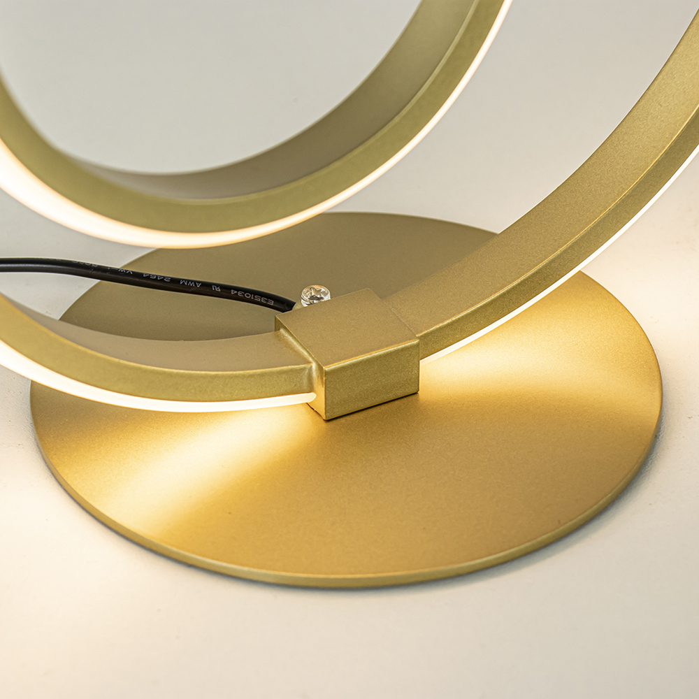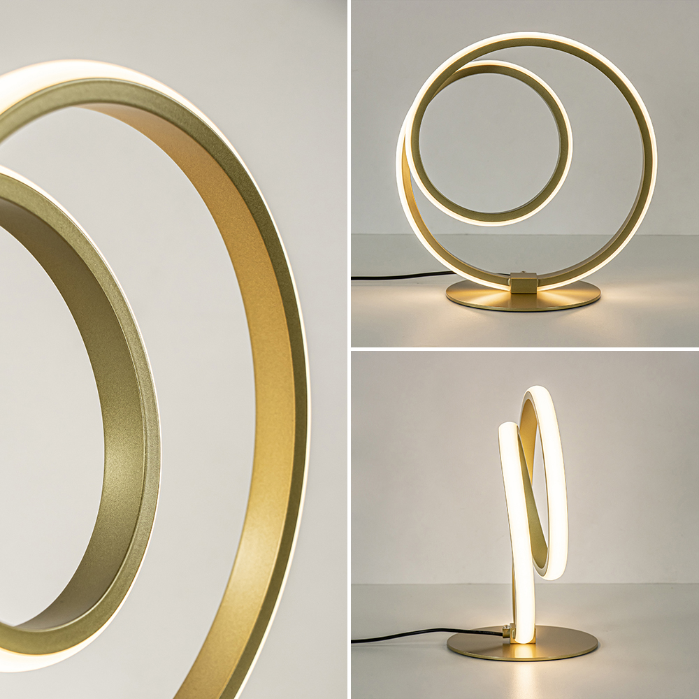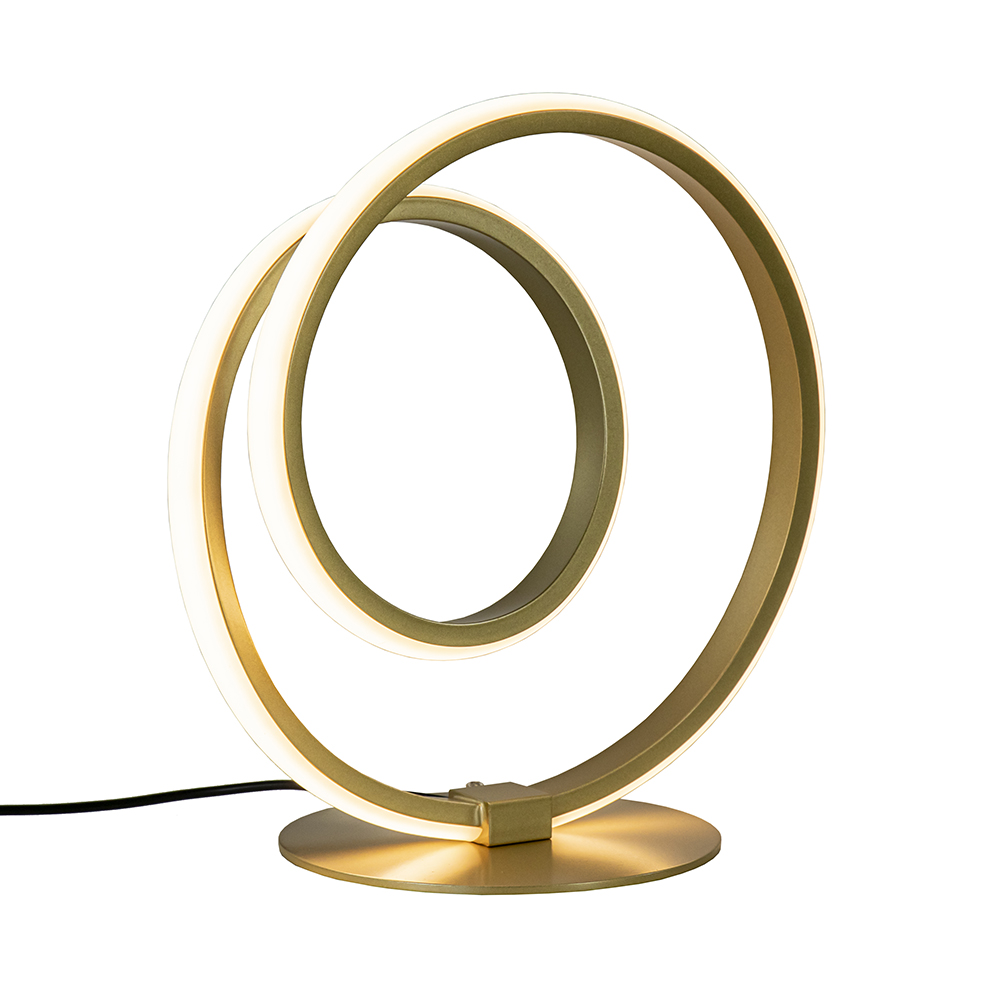 Deze kleine LED tafellamp is een moderne sfeermaker in het interieur. De tafellamp heeft een ronde metalen voet die het armatuur ondersteund. Het armatuur is uitgevoerd in het goud wat de lamp een trendy look geeft. In de krul is een LED strip verwerkt die van begin tot eind helemaal doorloopt. Dit zorgt ervoor dat de tafellamp diffuus licht verspreid. Het LED geeft met 2700 Kelvin een fijne warm witte verlichting en met 550 lumen een prima opbrengst. Dit is gemakkelijk te dimmen in 3 stappen dmv de dimmer in het snoer. Schakel snel tussen de standen en bepaal de juiste sfeer voor het juiste moment. De gouden LED tafellamp is voorzien van een zwart snoer met een lengte van 185 cm. Ideaal voor op een dressoir, in een kast of op het nachtkastje.
