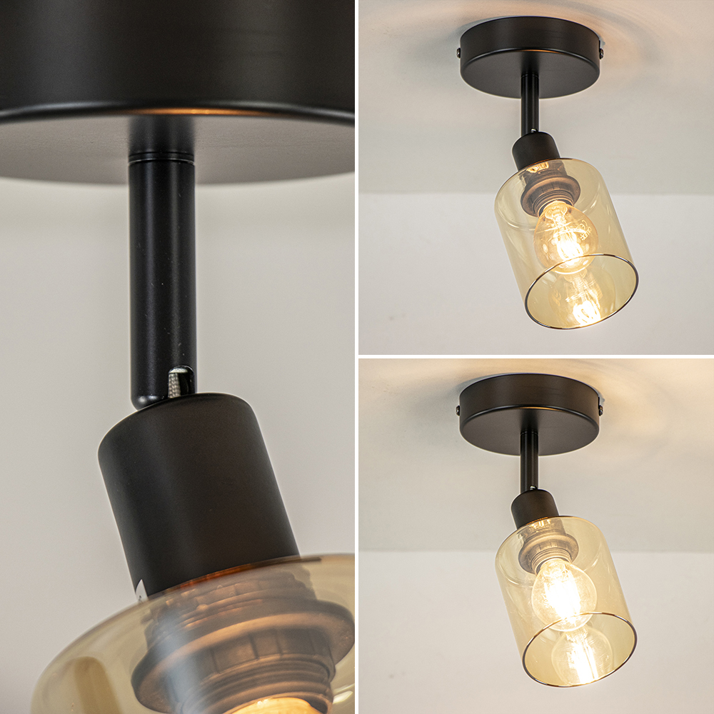Klein maar fijn. Deze 1-lichts plafondlamp is een kleine sfeermaker in het interieur. Het armatuur is gemaakt van metaal en uitgevoerd in het mat zwart. Dit is gecombineerd met een amber glazen kap in de vorm van een cilinder. De kap is verstelbaar en kan worden gedraaid en gekanteld. Ideaal voor in een hal, slaapkamer of het toilet. De plafondlamp met amber glas kan ook dienen als wandlamp.
