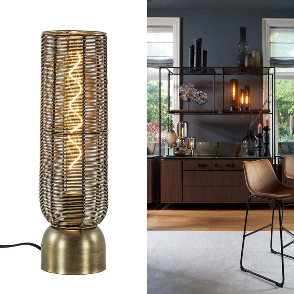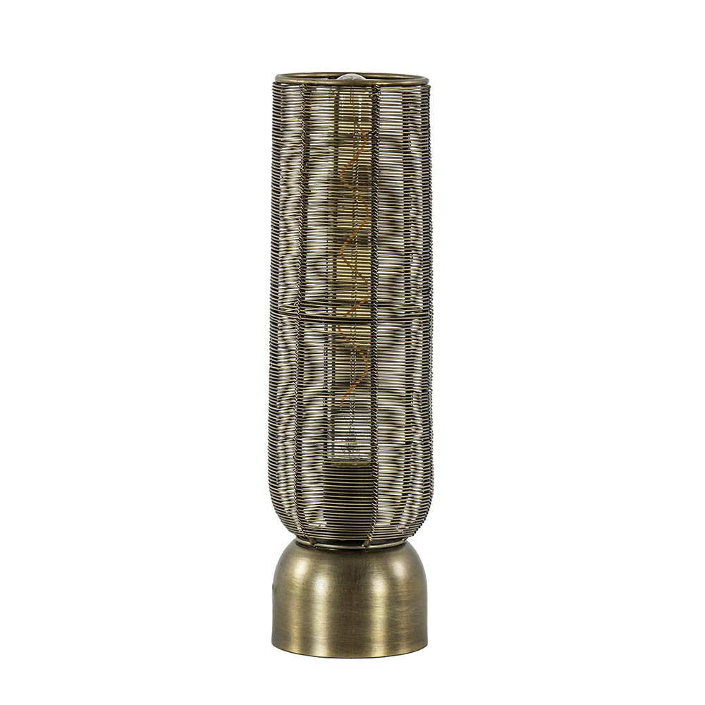 Perfect voor in een kast of op een dressoir. Deze kleine draad tafellamp Lezuza van Light and Living is een echte sfeermaker. De draadlamp is volledig gemaakt van metaal en uitgevoerd in het antiek brons. Dit maakt de lamp prima geschikt voor diverse woonstijlen als landelijk, Scandinavisch of trendy. De cilinder vormige tafellamp is voorzien van een zwart snoer met een lengte van 180 cm, de schakelaar bevindt zich op 85 cm in het snoer. Tafellamp Lezuza wordt geleverd zonder lichtbron (E27).