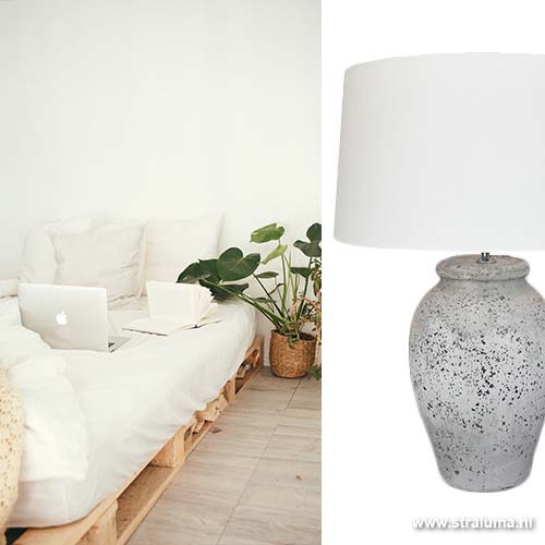 Deze stenen lampvoet staat prachtig in een industriële en landelijke inrichting. De Vulsini tafellamp heeft een licht verweerde look wat hem een stoere uitstraling geeft. De creme/grijze kleur maakt hem uitstekend te combineren met diverse kleuren lampenkappen. Door de lampvoet te combineren met een lampenkap uitgevoerd in taupe of grijs krijgt het geheel een stijlvolle uitstraling die super staat in bijvoorbeeld een landelijk of lifestyle interieur. Maar denk eens out-of-the-box en combineer de lampvoet eens met een aqua-blauwe of cassiskleurige kap. Let u er bij het bestellen wel op dat u de lampvoet en kap afzonderlijk van elkaar dient te bestellen.