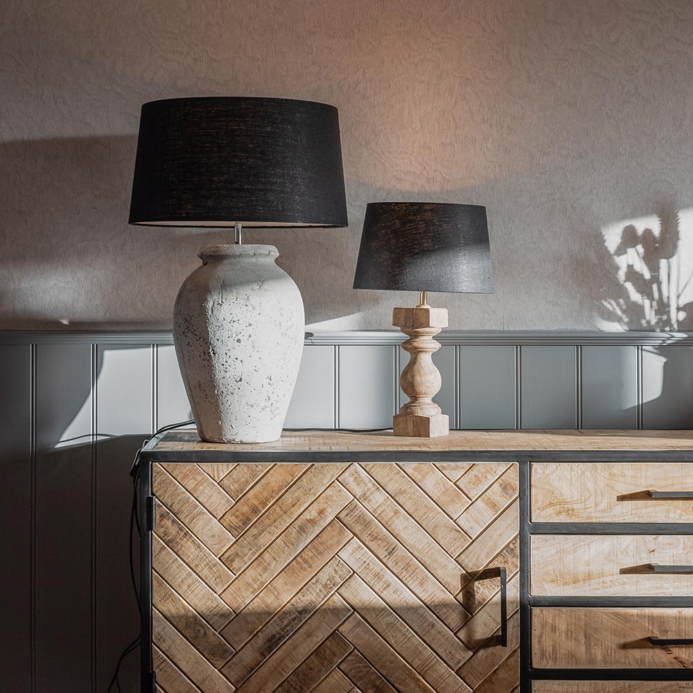 Deze landelijke tafellamp heeft een zwart snoer met een aan-/uitschakelaar op het snoer. Op de onderkant van de voet zit vilten bescherming. Zo raken uw meubels niet beschadigd.