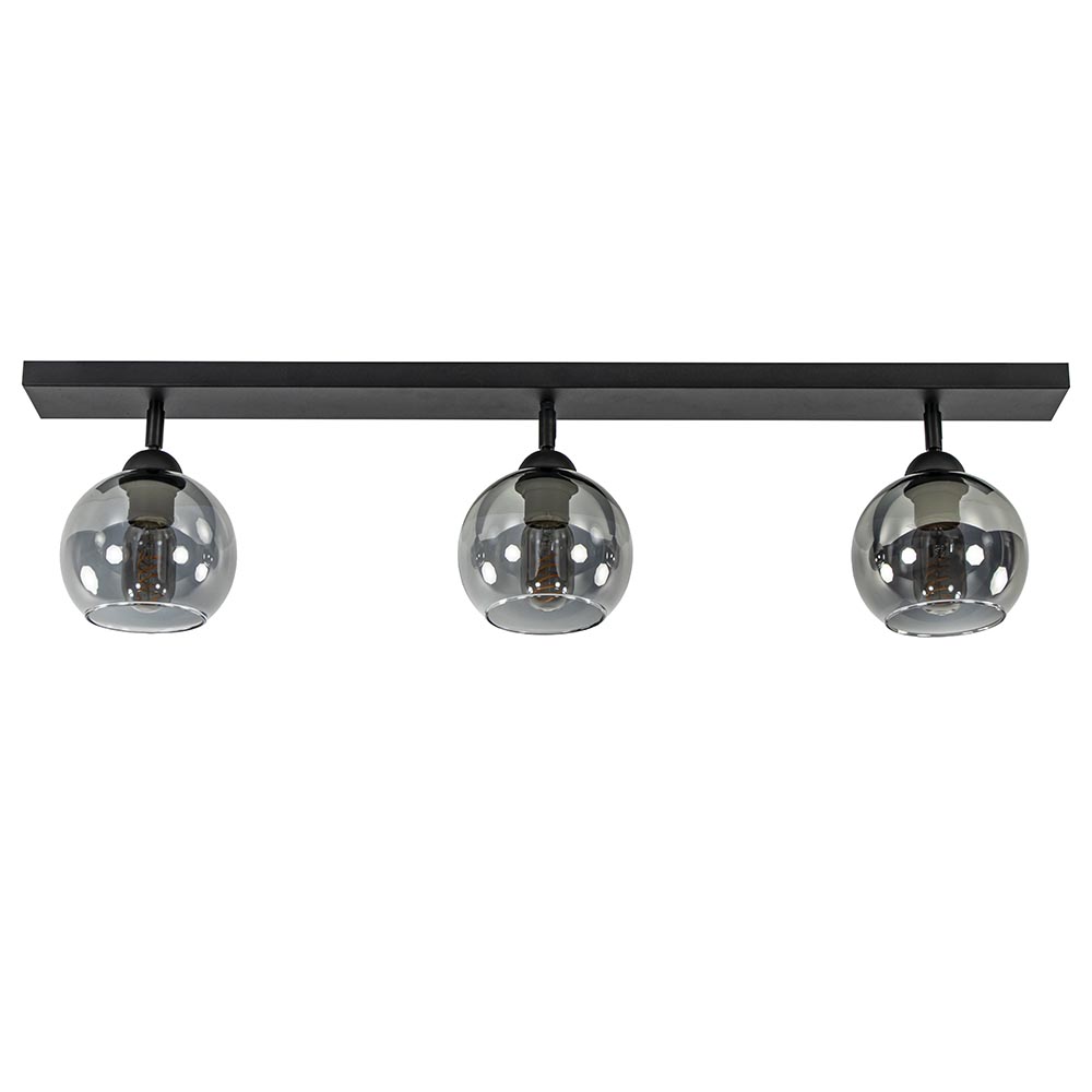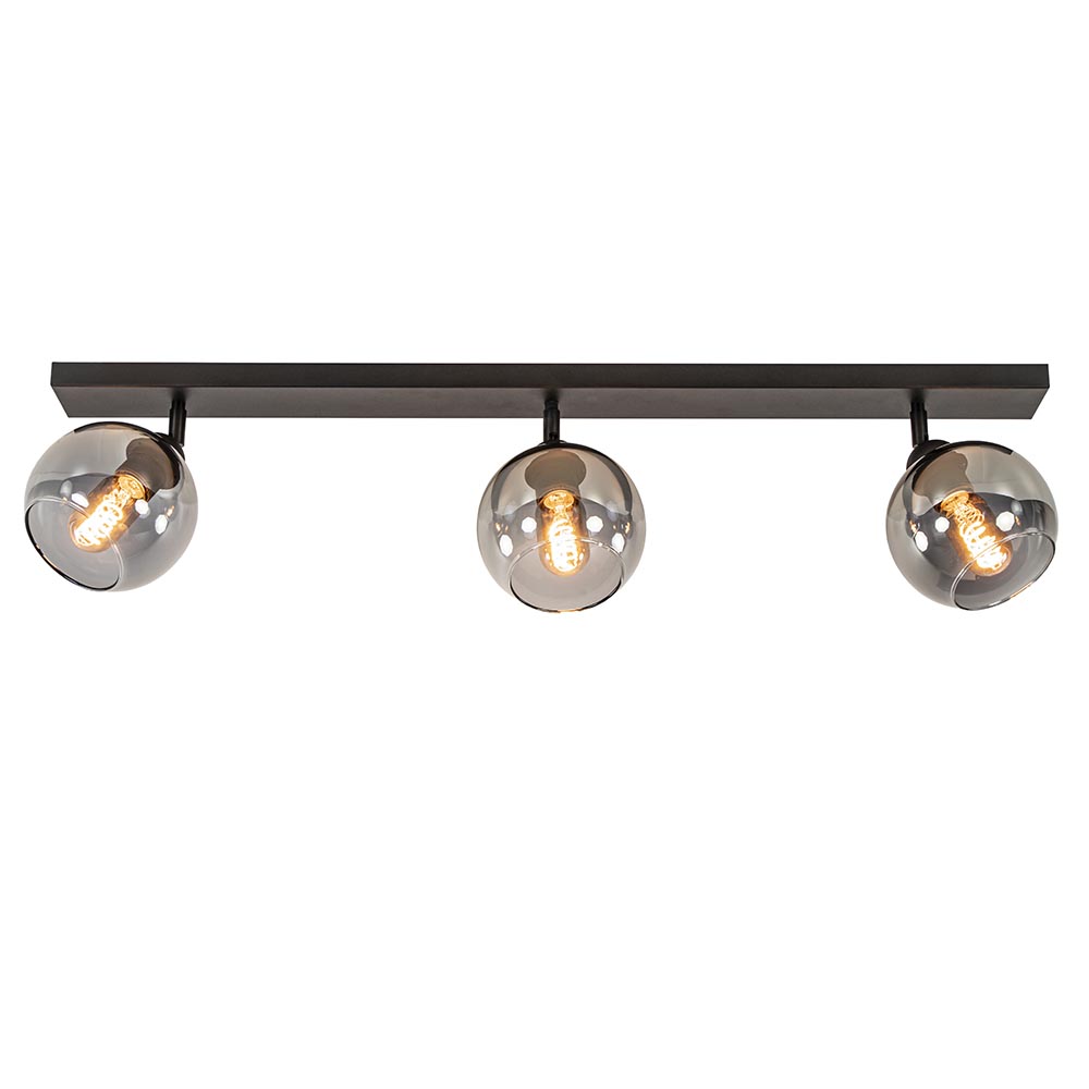 Stoere mat zwarte 3-lichts plafondlamp met smoke glas. De fittingen zijn 350 graden te draaien waardoor u de lamp helemaal eigen kunt maken. Deze plafondlamp is een mooie aanvulling in een hal of woonkamer. De smoke glazen bollen geven de plafondlamp een luxe uitstraling die mooi past in diverse woonstijlen. De 3-lichts plafondlamp wordt zonder lichtbronnen geleverd. De lamp is dimbaar met de juiste dimmer (exclusief).