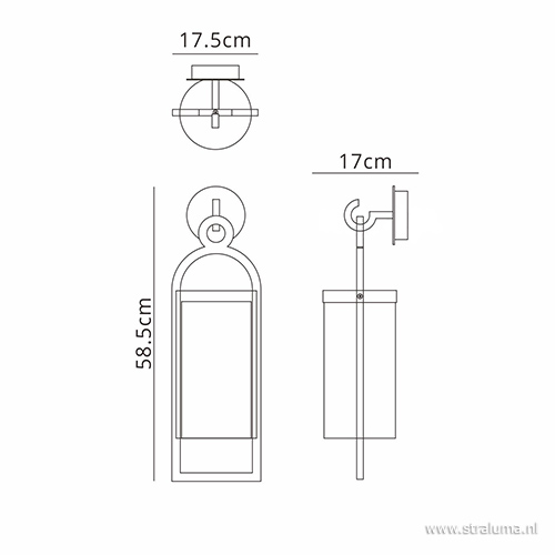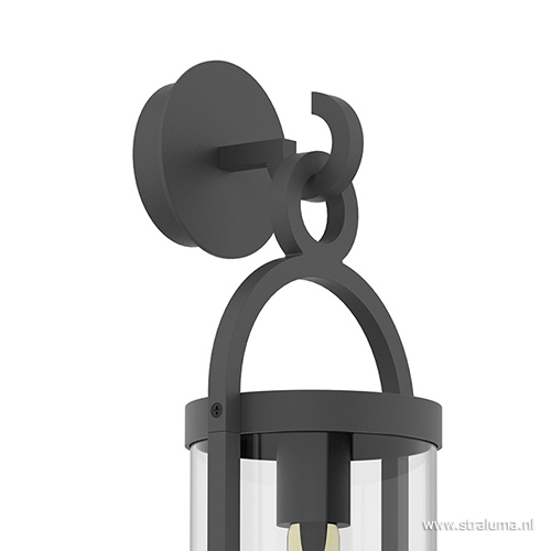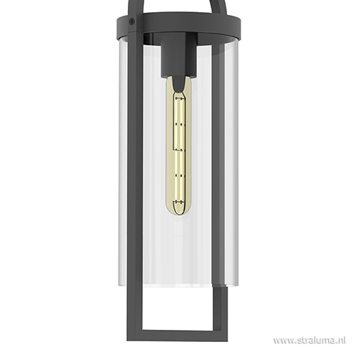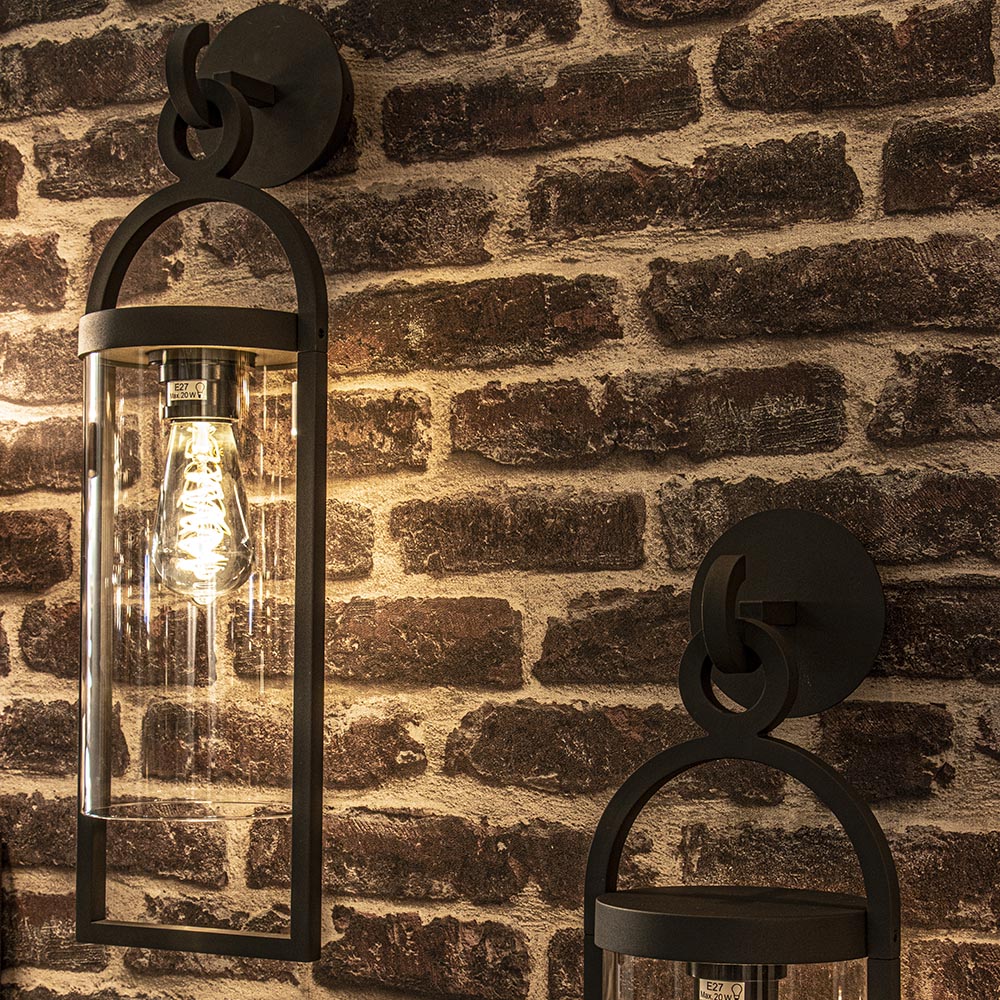 Geïnspireerd op de klassieke lantaarn van vroeger. Deze moderne versie is gemaakt van aluminium en voorzien van een glazen kap. Verschil met vroeger is dat de kap nu omgedraaid zit zodat de lichtbron hangt ipv staat zoals de kaarsen toentertijd, kan er ook geen water in blijven staan. De glazen kap zit verwerkt in het aluminium frame die net als vroeger hangt aan een haak. Het antraciete aluminium geeft de buitenlamp een moderne uitstraling. Voordeel van de lamp is dat er zelf kan worden gekozen voor een lichtbron (E27). Met een heldere bron wordt de lamp wat moderner, bij een vintage LED lichtbron krijgt de buiten wandlamp een landelijke uitstraling.