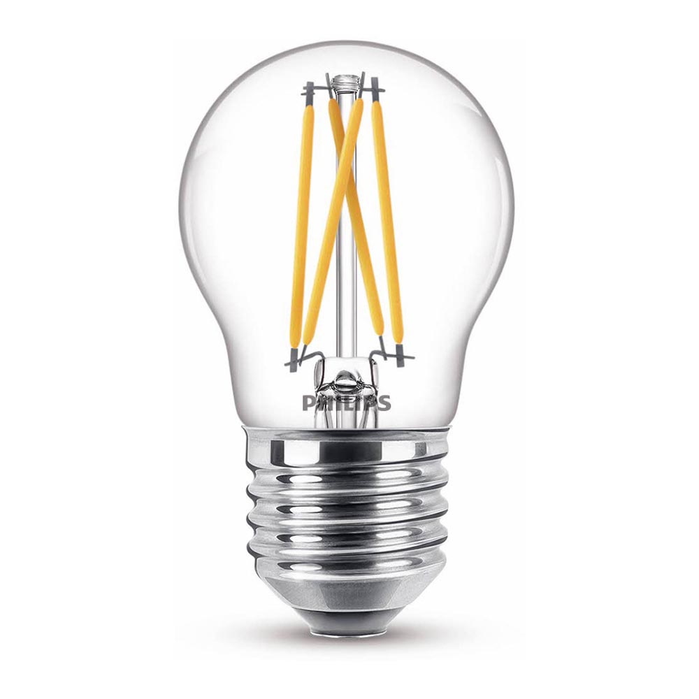 – 3.4W lichtbron (geeft licht als een 40W gloeilamp) – 470 Lumen – 2200-2700 kelvin – warm wit van kleur – peertje Ø 45 mm en 80 mm hoog – dimbaar